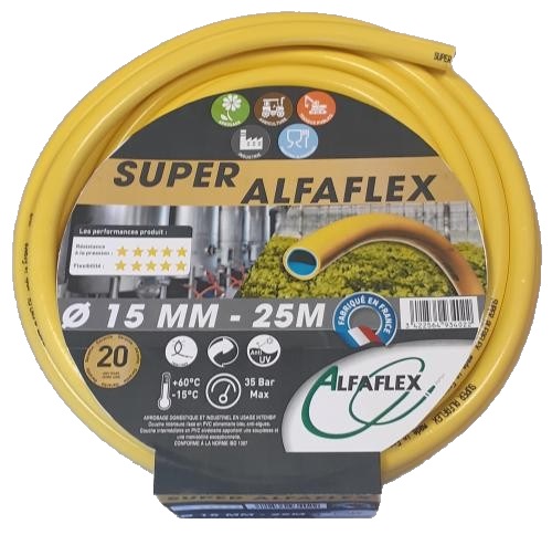 | Libellé | Tuyau d'arrosage diamètre 15mm longueur 25m - SUPER ALFAFLEX - AFSUP15025 |
