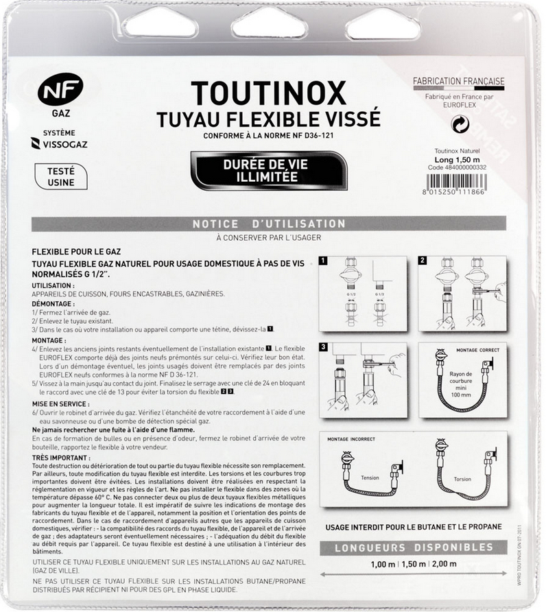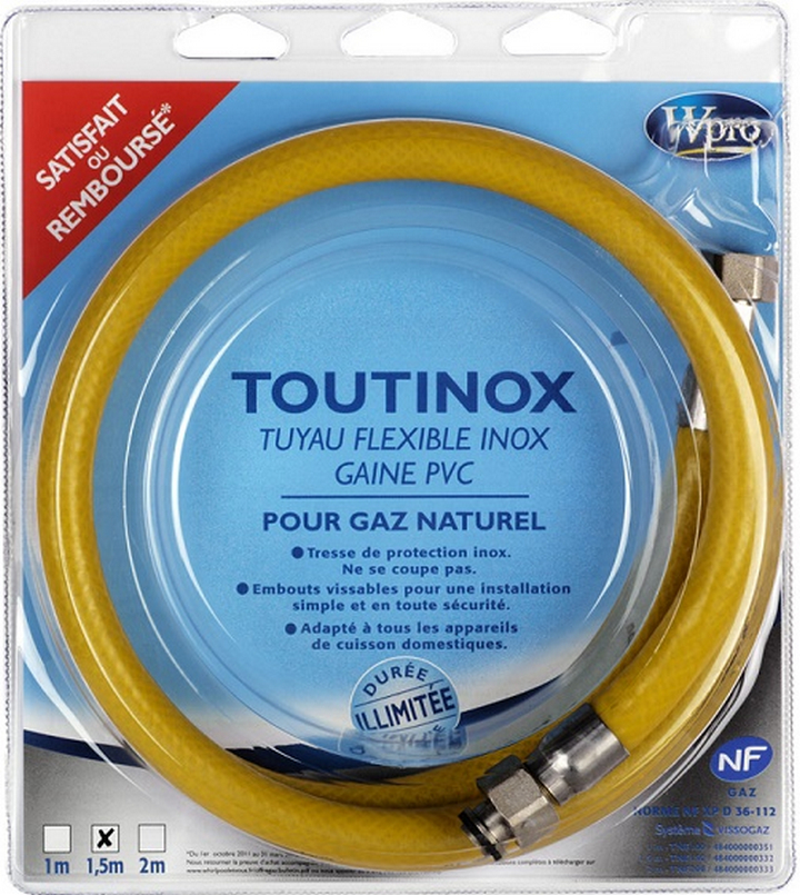 tne150 - tuyaux de gaz naturel illimitée 1m50 - Tuyaux de gaz flexible Toutinox Wpro TNE150 en inox gaine PVC pour tous les appareils de cuisson domestique. Compatible avec Gaz naturel (Norme NF D 36-121). Embouts vissables pour une installation simple et en toute sécurité. Durée de vie illimitée. Système VISSOGAZ recommandé par GAZ DE France.