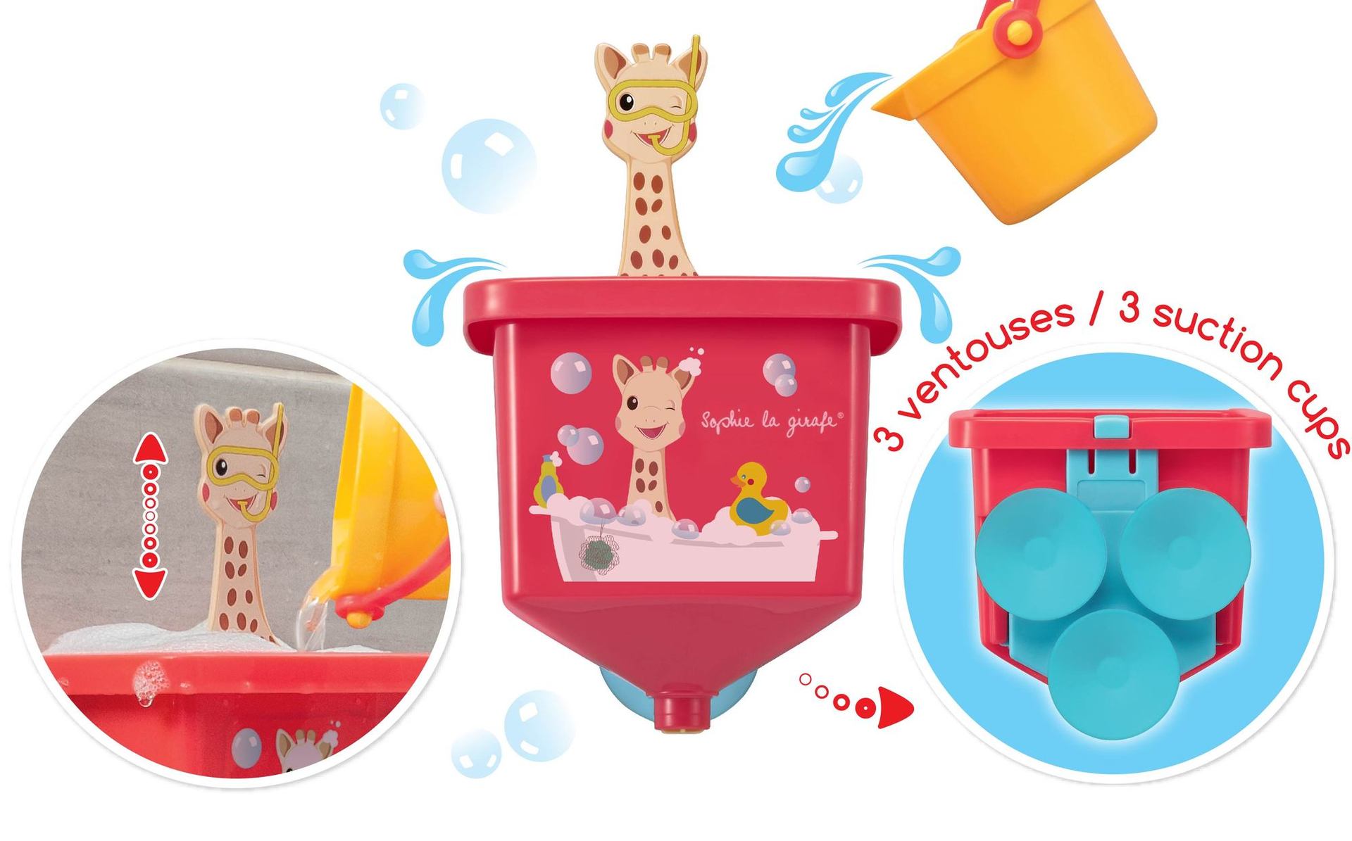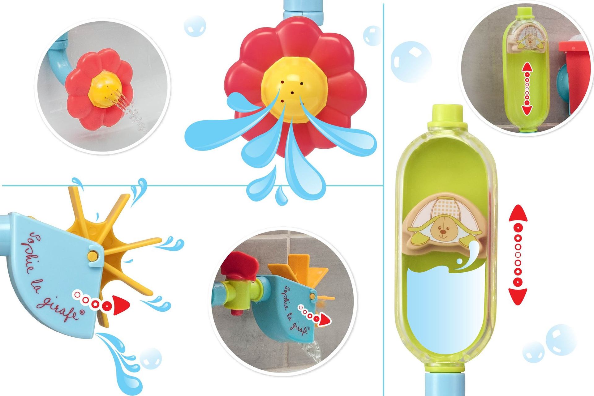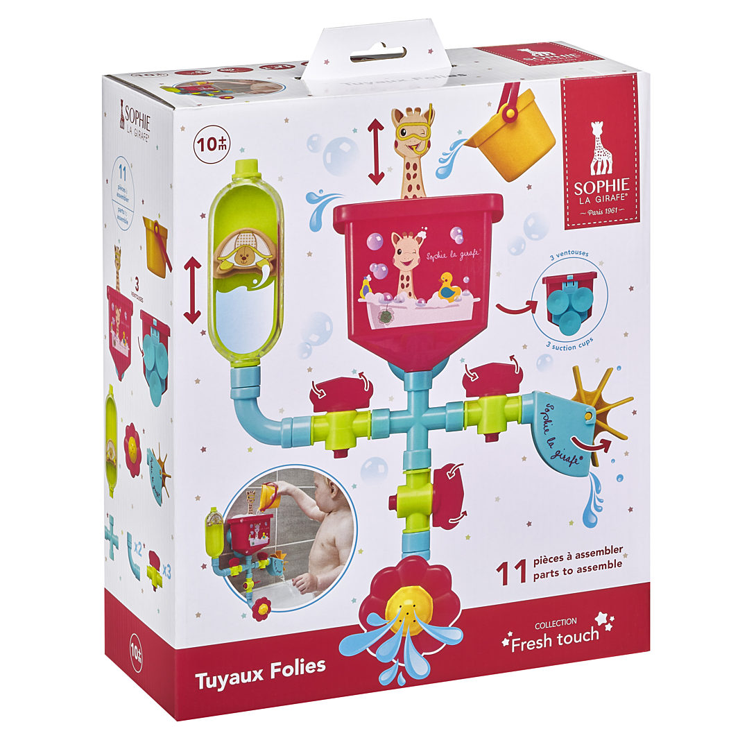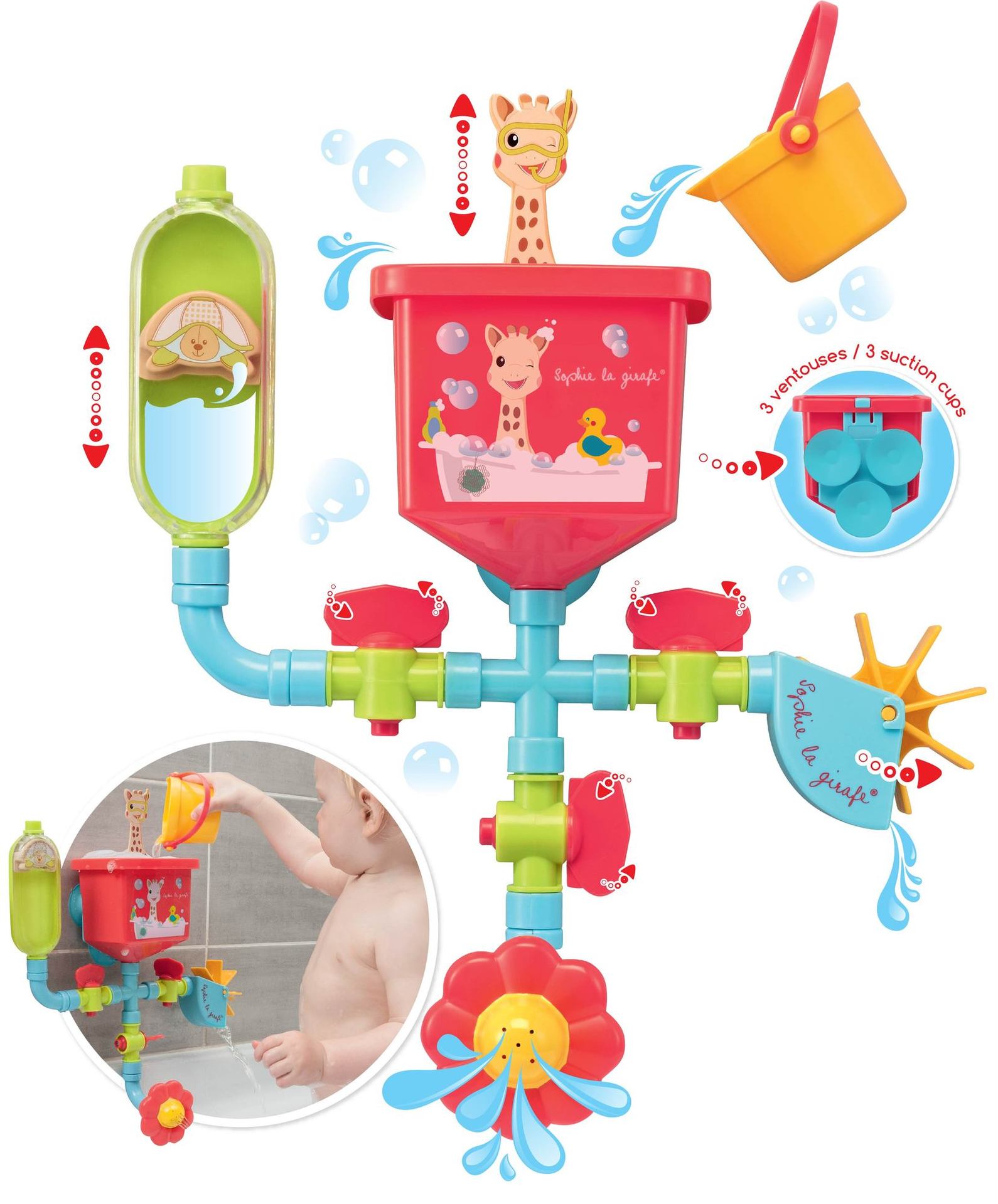 "Bébé bricole dans son bain avec ses tuyaux, robinets et activités diverses qu’il monte et démonte ! Tout en s’amusant avec les circuits d’eau, bébé apprend la notion de cause à effet ! Lorsqu’il ouvre un des 3 robinets, bébé peut voir: - Margot la tortue nager dans son bocal - le moulin tourner - l’eau jaillir de la fleur Si bébé ferme un des 3 robinets la fonction reliée s’arrête aussitôt. Lorsque les 3 robinets sont fermés: - l’eau monte dans le réservoir principal et Sophie la girafe apparait comme par magie avec son masque et son tuba! Se fixe facilement à la paroi de la baignoire grâce à ses 3 ventouses."