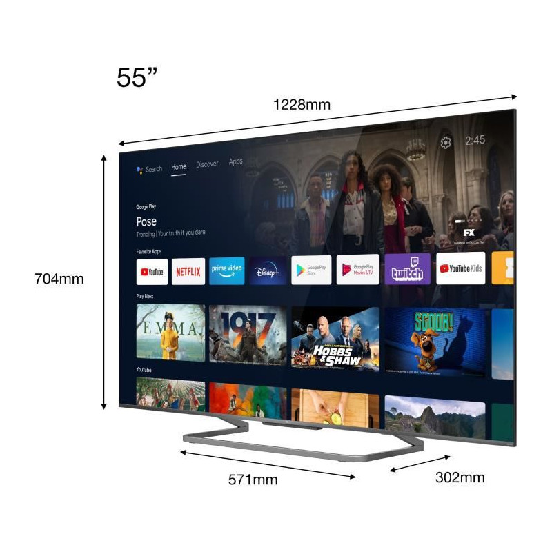 Ecran 55" pouces (139 cm) Smart TV - Android TV 4 ports HDMI - 1 port USB - Wi-Fi Intégré Contraste dynamique : Mega