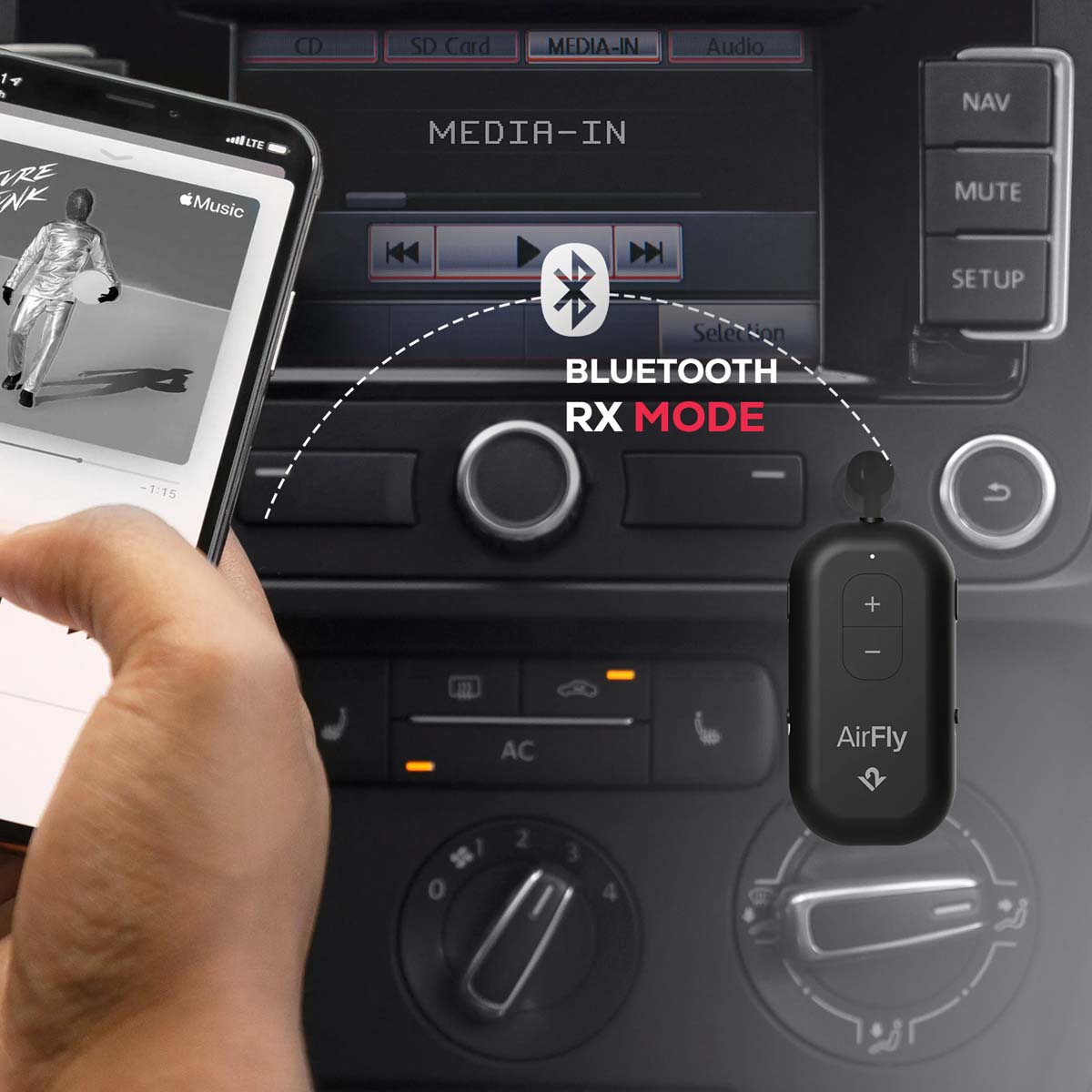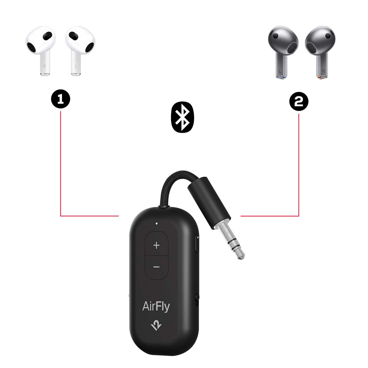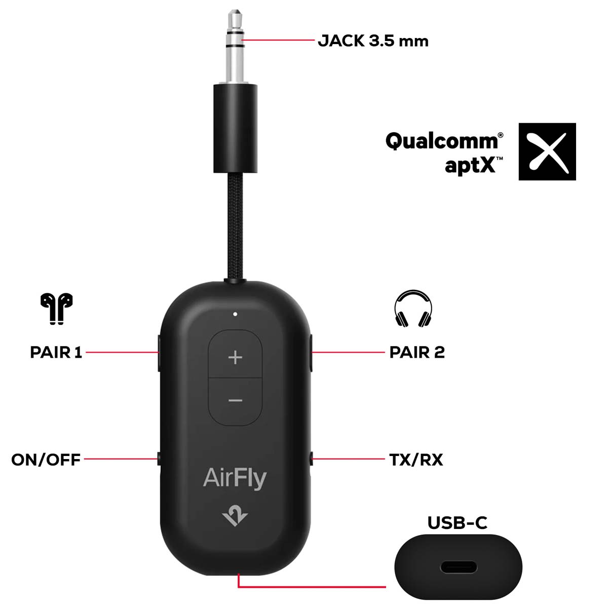 Transmetteur audio Bluetooth AirFly Pro 2 avec prise jack 3.5 mm. Fonction double émetteur et récepteur. Compatible TV, avion, autoradio, consoles, etc. Appairage possible avec deux casques simultanément. Autonomie jusqu'à 25 heures. Compact, idéal pour les déplacements et les connexions sans fil.