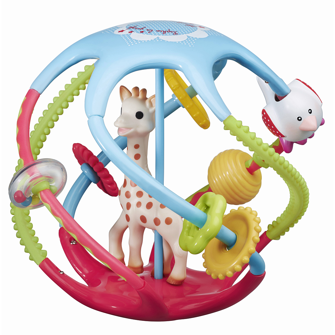 Une balle sensorielle pour éveiller les sens de bébé ! La surface de la balle propose différentes textures pour développer le toucher de bébé. On découvre en relief Sophie la girafe et ses amis, des stries, des étoiles et des pois... Idéale pour développer la dextérité et la coordination des mouvements, bébé s’amuse à la lancer et la faire rouler. La balle contient des grelots de couleurs pour stimuler son ouïe et sa vue lorsqu’il s’amuse à la secouer ou à la faire rouler. Légère et facile à saisir, elle est parfaitement adaptée aux petites mains de bébé