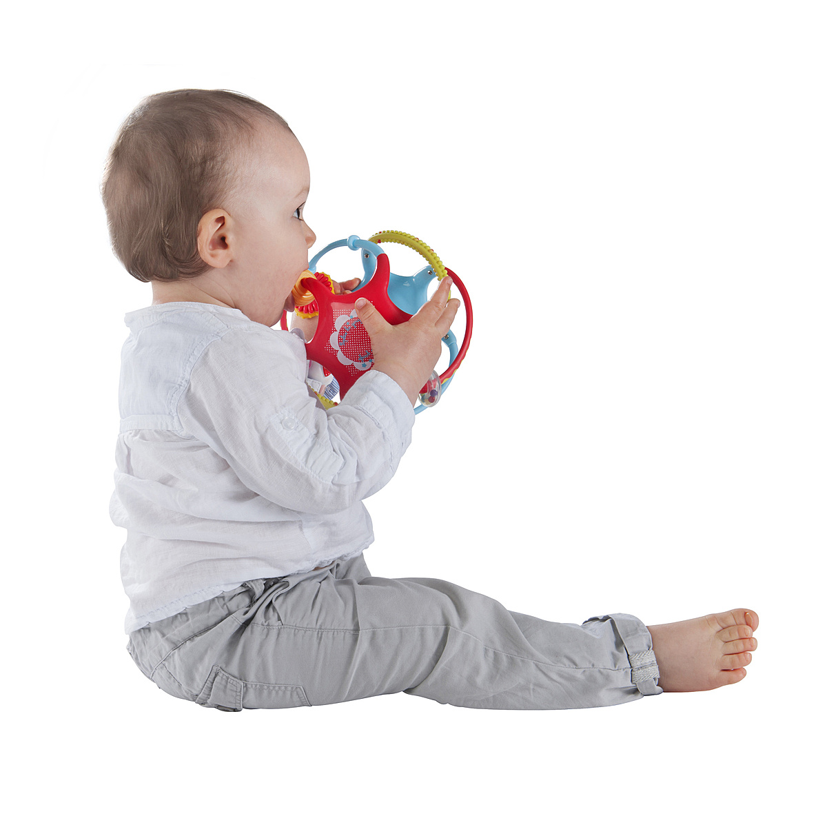 | Plus produit | - Pour développer sa motricité fine, bébé peut aussi jouer avec Sophie en la faisant tourner sur elle-même ou encore aider Lazare le chat à attraper sa pelote de laine.\n- La Twistinball stimule également son toucher, à travers différentes matières et textures (lisses, bombées, striées...) et sa vue grâce à ses couleurs vives et attractives. \n- Dotée de 2 anneaux et 2 tiges en matière soft, la balle offre à bébé\ndes parties à mordiller pour soulager ses gencives douloureuses. |