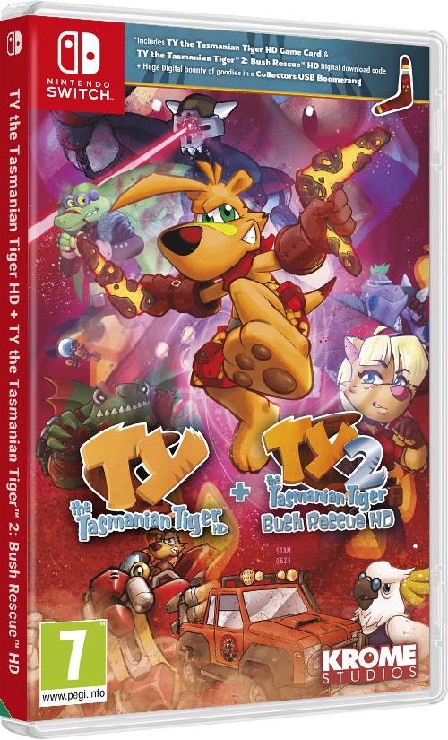 Plus-Produit : Contient : - le jeu : Ty the Tasmanian Tiger HD - le jeu : Ty the Tasmanian Tiger 2 Bush Rescue TY the Tasmanian Tiger HD + TY the Tasmanian Tiger 2: Bush Rescue HD: Bundle contient en bonus une clé USB \"Boomerang\" exclusive et personnalisée. Il est livré avec de nombreux goodies numériques incluant : - Les bandes-son de TY 1 & 2 aux formats MP3 et FLAC - Les artbooks officiels de TY 1 & 2 - Des paper toys \"Cubees\" à imprimer - Des posters TY 1 & 2 Avec TY, le BOOMERANG fait BANG ! TY, le tigre de Tasmanie 2 : Opération Sauvetage est la suite du charmant jeu vidéo inspiré de l'Australie de Krome Studios. Ce jeu de plateforme rétro, adapté pour la Nintendo Switch(TM), a plus de boomerangs, plus de véhicules, plus de robots et plus de TOUT... dans une aventure en monde ouvert en Australie.