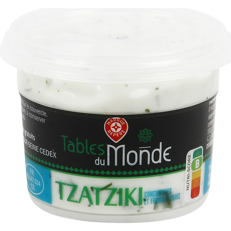 Ingrédients: Fromage frais 0 % de matières grasses 63 %, concombre 25 %, huile de colza, aneth 0,9%, sel, huile d'olive vierge extra, sucre, jus de citron concentré, crème fraîche, ail, épaississant: gomme xanthane, conservateur: E202.