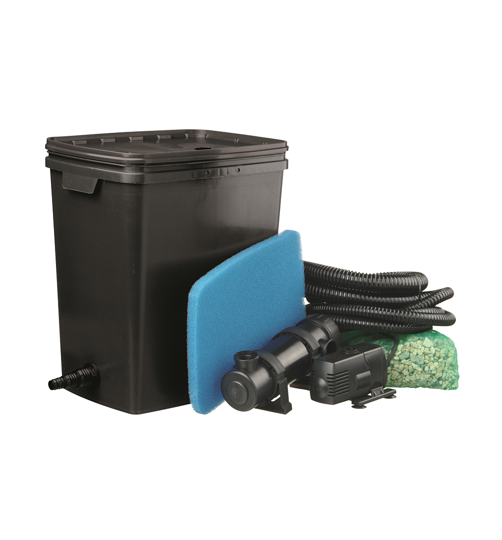 Système à une chambre comprenant différents éléments pour la filtration mécanique, biologique et UV-C de l'eau d'un bassin de 7000 litres maximum. Comprend : 1 corps de filtre + 1 filtre Uv 11 W + 1 pompe débit 1600 L/h, puis. 35 W + raccords, tuyaux d'alimentation et de refoulement et masses filtrantes.