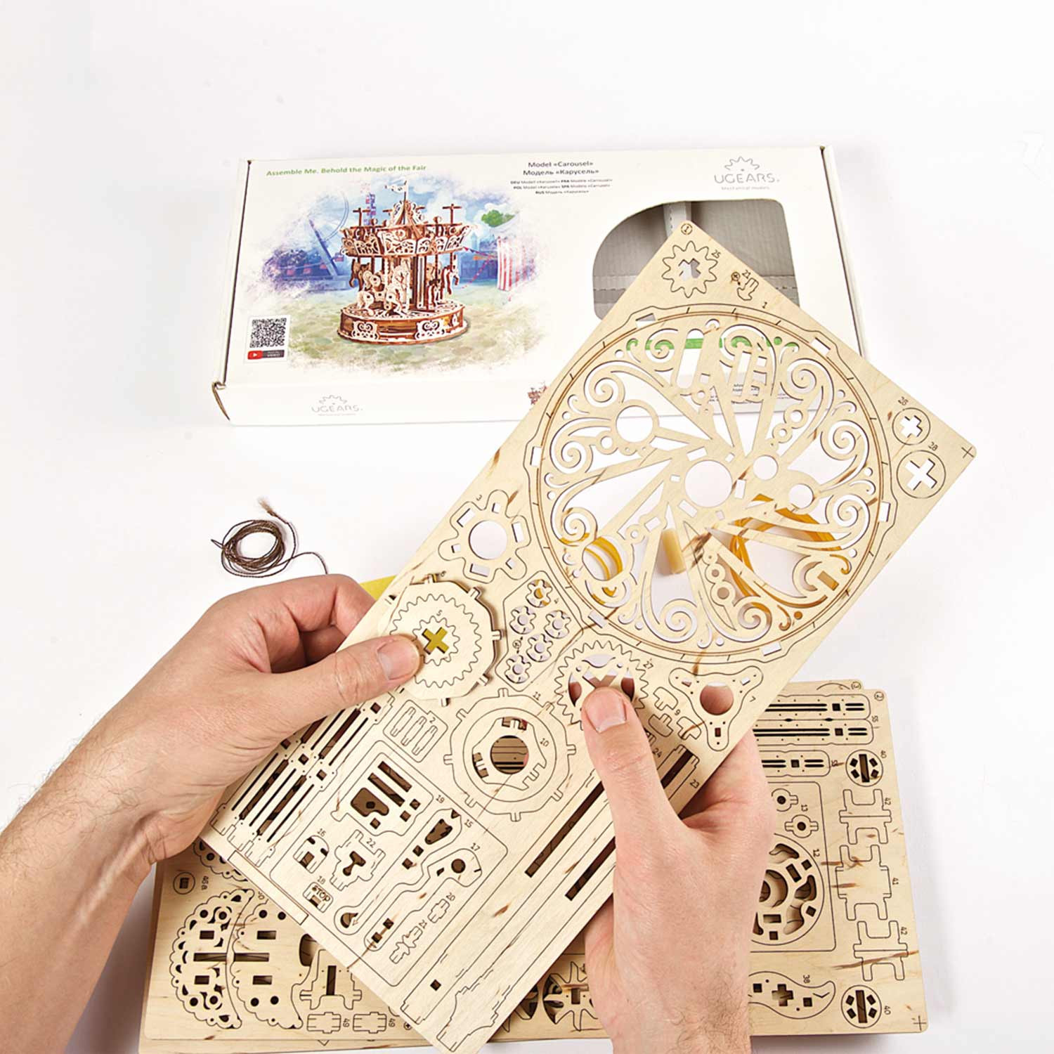 En ce qui concerne les aspects techniques, le carrousel Ugears est basé sur le même principe que la plupart des modèles automoteurs Ugears : toutes les pièces du puzzle sont assemblées sans colle ni outils supplémentaires et l’énergie de mouvement est fournie par un moteur à élastique. Le Carrousel possède une clé d’enroulement sous sa base qui assure la tension des élastiques fixés à l’axe principal. Le pendule descend sur l’axe et rend le mouvement des modules et des détails plus doux. L’axe principal est relié au pôle central par un engrenage planétaire qui assure sa rotation dans le sens opposé à la plate-forme principale. Le toit est également attaché à l’axe principal et à des vilebrequins qui font monter et descendre les chevaux tout en tournant autour du pôle central.