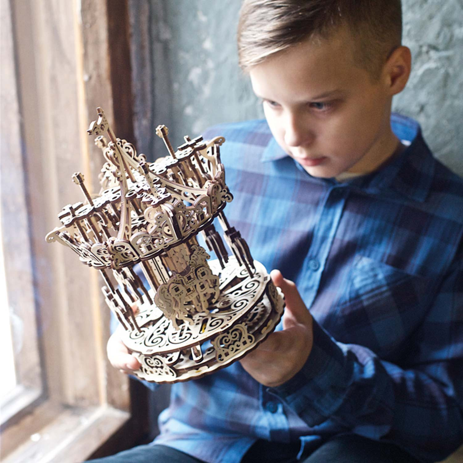 Aller et retour à l’endroit où tout a commencé… Faites un voyage dans vos souvenirs d’enfance avec le magnifique modèle nostalgique d’Ugears, le Carousel.