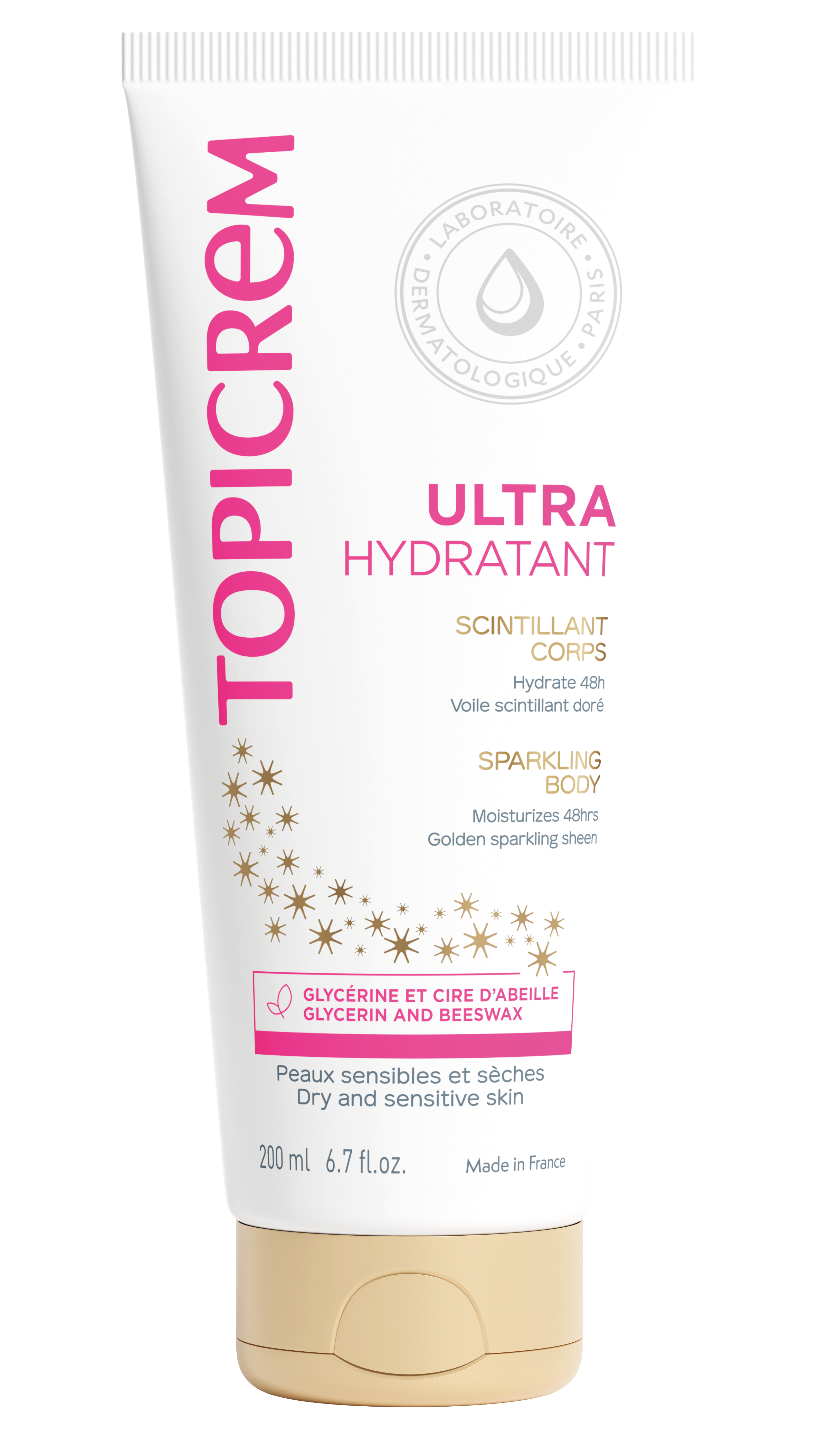 Topicrem ultra-hydratant scintillant corps 200 ml sous forme d'émulsion onctueuse, pénètre rapidement dans la peau, pour hydrater pendant 24 heures et illuminer. riche en agents hydratants et en micro-paillettes dorées, le topicrem ultra-hydratant scintillant corps offre à la peau : douceur, souplesse et confort, tout en la parant d'un voile irisé scintillant, qui la rend plus lumineuse. idéale pour les peaux sensibles et sèches. testée sous contrôle dermatologique. .