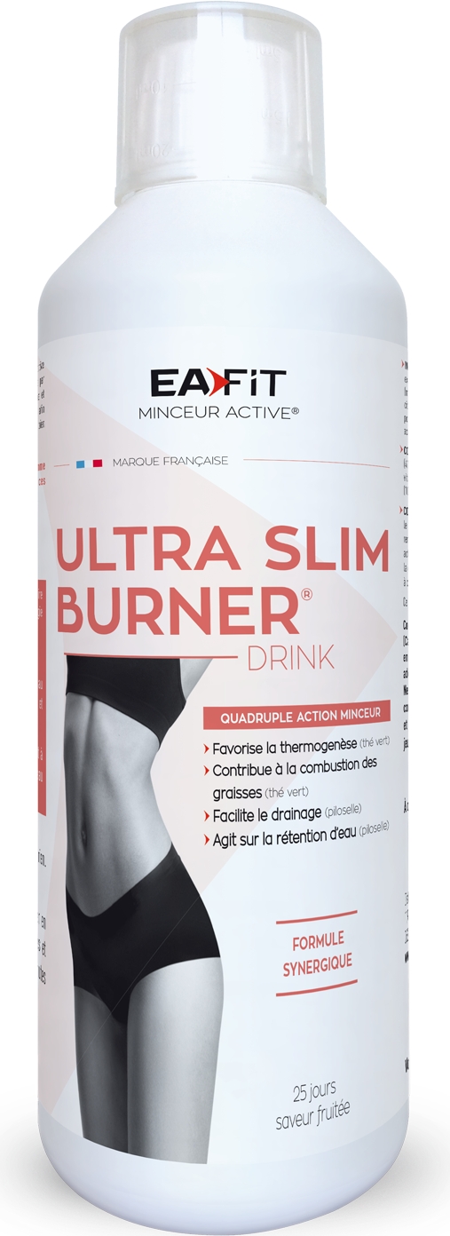 ULTRA SLIM BURNER DRINK est un complément alimentaire formulé en laboratoire par les spécialistes en nutrition d’EAFIT Minceur Active. ULTRA SLIM BURNER DRINK associe plusieurs principes actifs qui agissent ensemble pour apporter une quadruple action minceur grâce : à l’extrait de thé vert titré en caféine qui stimule la thermogenèse à l’extrait de guarana qui active le déstockage des graisses et leur transformation en énergie au chrome, oligo-élément essentiel qui contribue au métabolisme des macronutriments dont les graisses et sucres à l’extrait de piloselle qui aide à améliorer le drainage, l’élimination de l’eau et des toxines et limite la rétention d’eau
