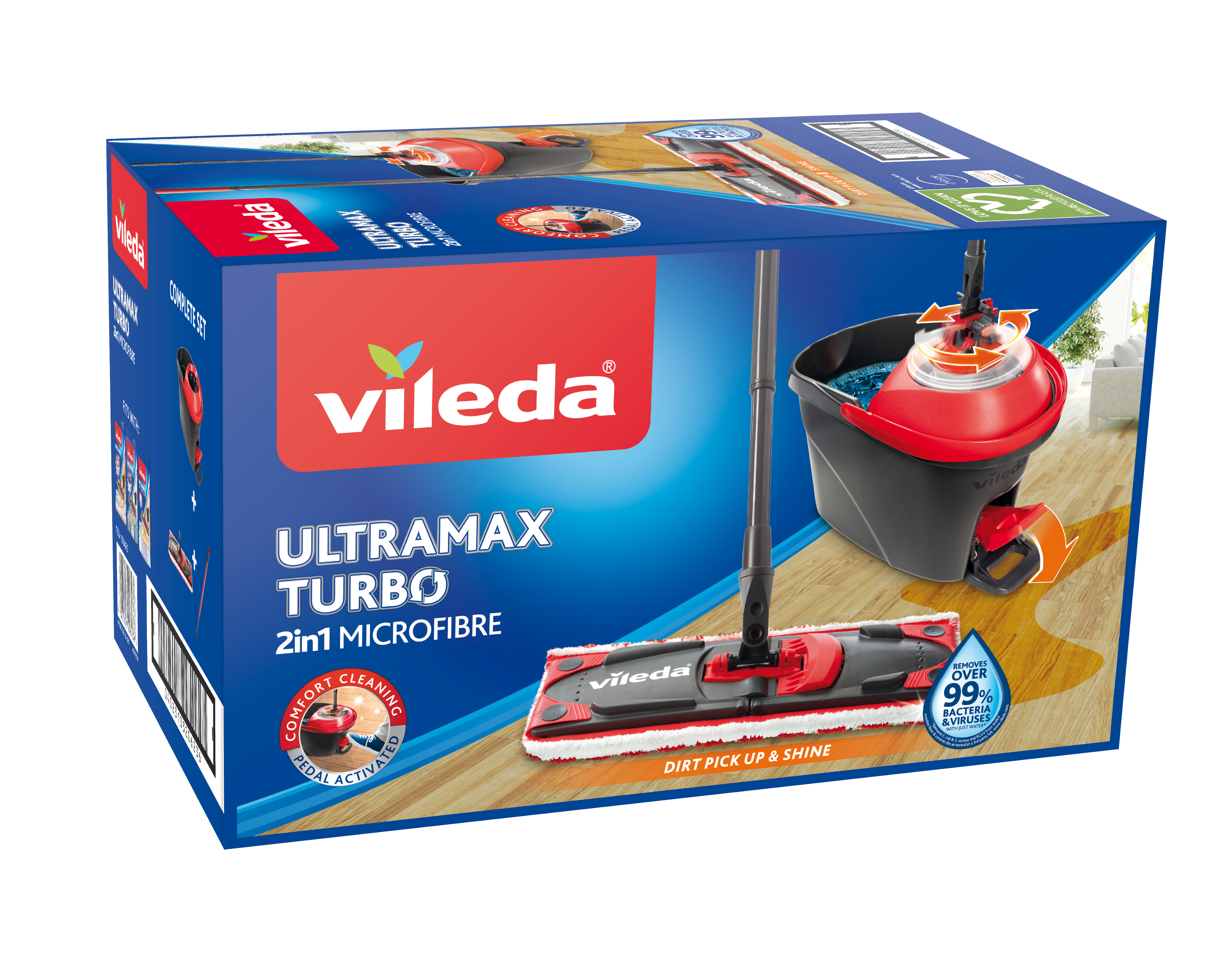Kit complet Ultramax - contient une tête de balai avec une housse en microfibre, un manche, un seau et un essoreur. Housse en microfibres 2in1 pour éliminer les saletés tenaces et offrir d'excellentes performances de nettoyage. Retire plus de 99% des bactéries & Virus avec juste de l'eau* Le seau spécialement conçu et l'essoreur asymétrique assurent une humidité optimale de la tête de balai pour une utilisation sur différents types de sols: carrelage, vinyle, pierre, bois ou stratifié. Bec verseur pour verser l'eau sale sans éclaboussures Les housses sont disponibles séparément; peuvent être lavées en machine jusqu'à 60°C avec des textiles similaires et pour un pouvoir nettoyant constant nous conseillons de la remplacer tous les 6 mois. Système de nettoyage durable - Ce système de nettoyage contient plus de 40% de matériaux recyclés et est produit en Europe, ce qui réduit son empreinte CO2.