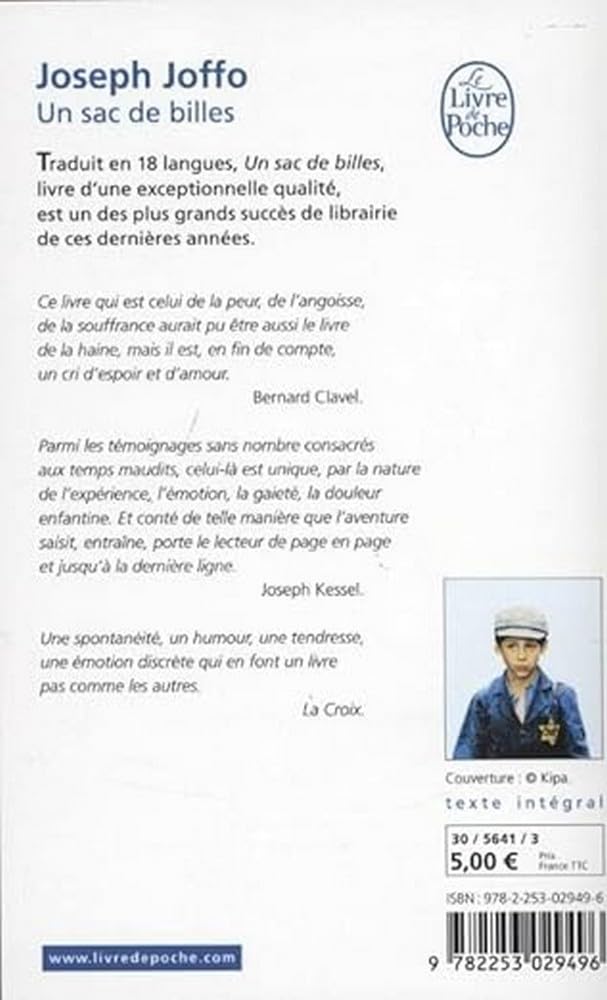 Paris, 1941. La France est occupée. Joseph et Maurice, deux frères juifs âgés de dix et douze ans, partent seuls sur les routes pour tenter de gagner la zone libre. Récit autobiographique publié en 1973, traduit en dix-huit langues. Un sac de billes est un des plus grands succès de librairie de ces dernières décennies.