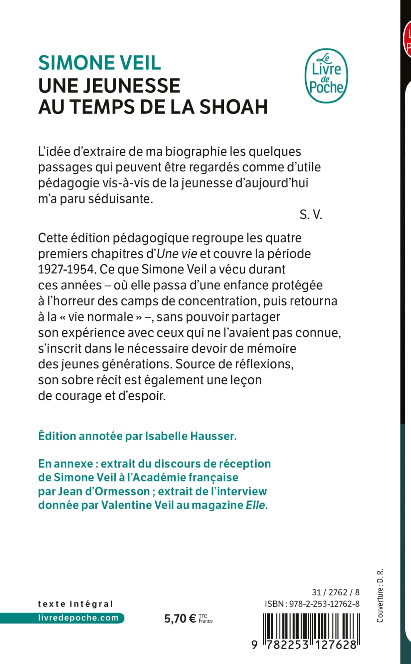 L’idée d’extraire de ma biographie les quelques passages qui peuvent être regardés comme d’utile pédagogie vis-à-vis de la jeunesse d’aujourd’hui m’a paru séduisante. Simone Veil. Cette édition pédagogique regroupe les quatre premiers chapitres d’Une vie et couvre la période 1927-1954. Ce que Simone Veil a vécu durant ces années – où elle passa d’une enfance protégée à l’horreur des camps de concentration, puis retourna à la « vie normale » – sans pouvoir partager son expérience avec ceux qui ne l’avaient pas connue, s’inscrit dans le nécessaire devoir de mémoire des jeunes générations. Source de réflexions, son sobre récit est également une leçon de courage et d’espoir.