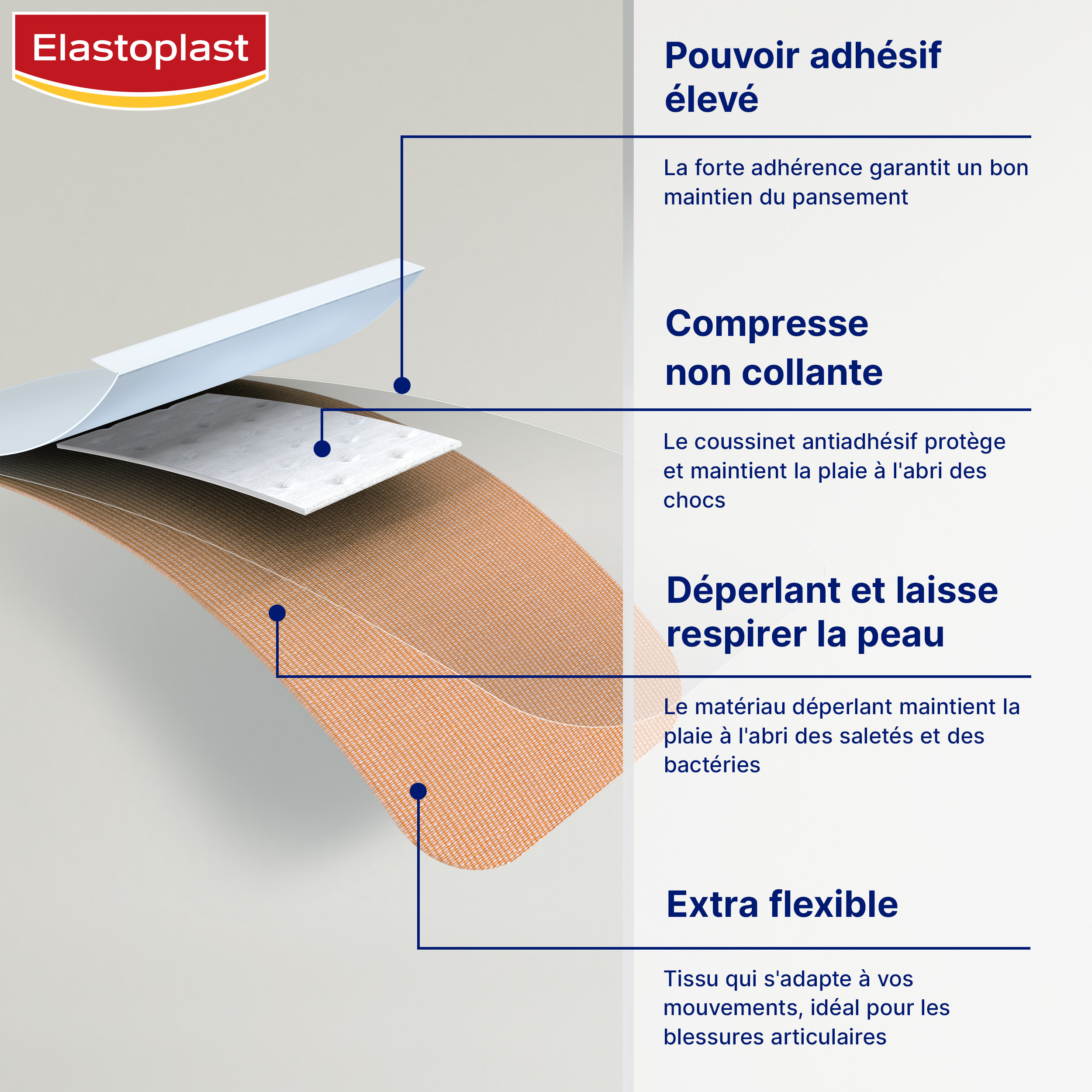 Les bandes Universel Tissu Elastoplast sont très flexibles et laissent respirer la peau. - Pouvoir adhésif élevé. - Protège la plaie et amortit les chocs. - Idéal pour les articulations. - Pansement en tissu et Résistant. 0% latex : pas de risque d'allergie due au latex