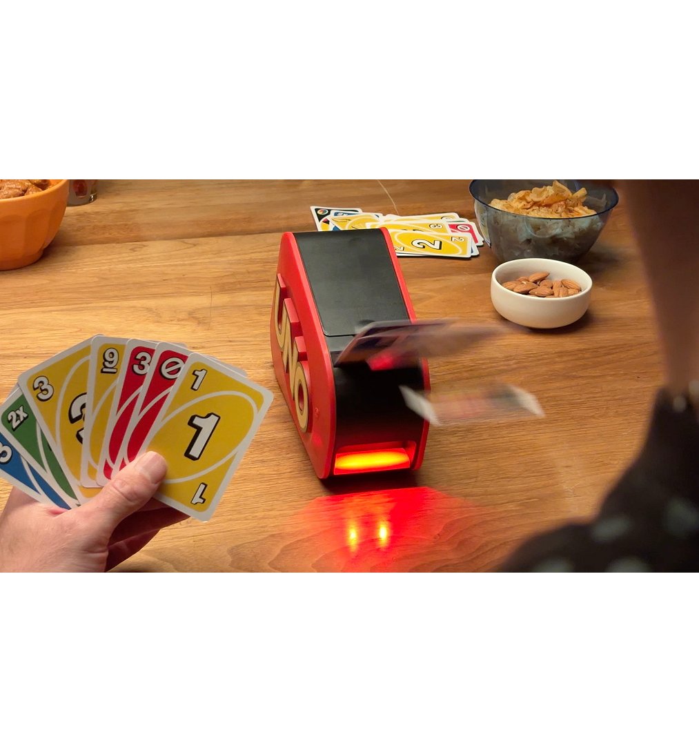 Uno en version lumière et sons et un lanceur de cartes aléatoire avec lequel les cartes volent haut ! Tenez vous prêt ! Les parties de UNO n'ont jamais été aussi drôles.