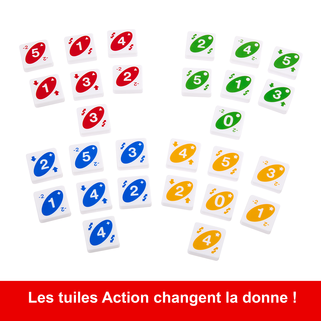 | Plus produit | Un jeu de stratégie où il faut aligner quatre jetons de même couleur et/ou avec le même chiffre.\nLa base du jeu et les jetons élaborés en plastique en font un jeu durable et facilement transportable.\nLes jetons daction vous permettent déchanger la position de deux rangées, de retirer un jeton dune rangée ou dobliger un autre joueur à se défausser de deux jetons.\nVous pouvez aligner les jetons en diagonale, verticalement ou horizontalement.\nDes symboles graphiques spéciaux ont été ajoutés afin daider les joueurs daltoniens à identifier la couleur des jetons. |