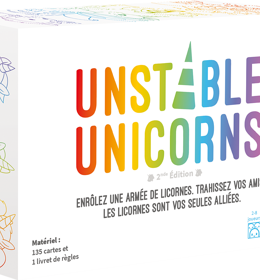 Dans Unstable Unicorns vous devrez proteger votre écurie de Licornes des attaques de vos adversaires et vous vengez avec votre armée de licornes et leurs pouvoirs magiques !