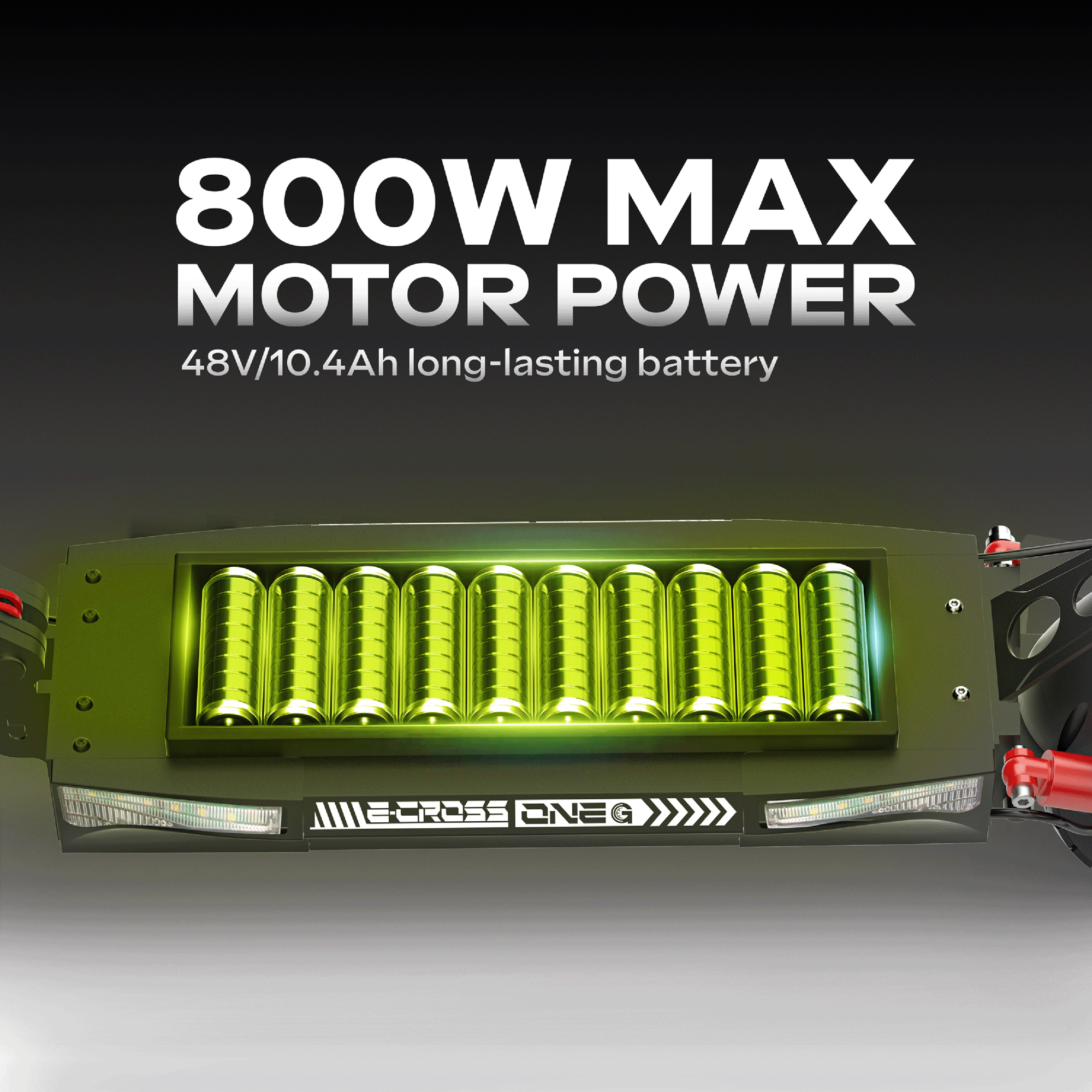 Urbanglide E-Cross Pro. Type: Scooter classique, Vitesse de pointe: 25 km/h, Poids de charge maximum: 120 kg. Capacité de la batterie: 13 Ah, Puissance du moteur: 800 W, Tension des piles: 54,6 V. Largeur: 605 mm, Profondeur: 1200 mm, Hauteur: 1285 mm. Dimension de la roue: 10"
