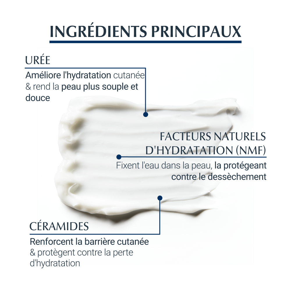 Ingrédients : Aqua, urea, glycerin, isopropyl stearate, dicaprylyl ether, glyceryl glucoside, sodium lactate, butyrospermum parkii butter, Nylon-12, polyglyceryl-4 diisostearate/polyhydroxystearate/sebacate, tapioca starch, carnitine, cetearyl alcohol, ceramide NP, arginine HCL, sodium PCA, histidine HCI, lactic acid, mannitol, arginine, serine, sucrose, PCA, citrulline, glycogen, alanine, threonine, glutamic acid, lysine HCI, sodium chloride, 1,2-hexanediol, phenoxyethanol, potassium sorbate.
