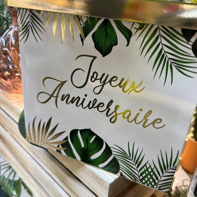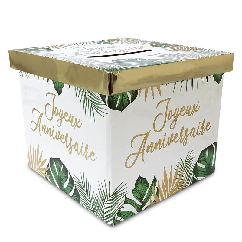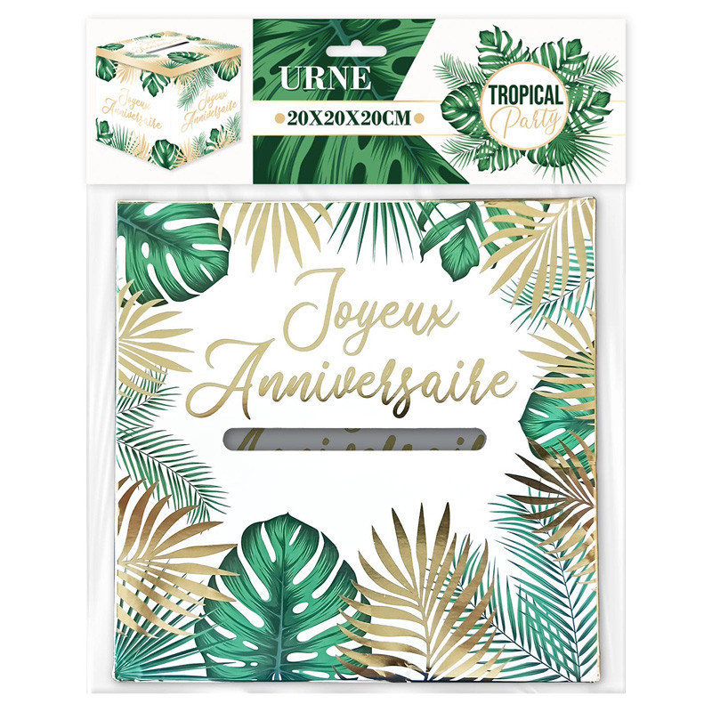Urne - Motif tropical - Carré - Joyeux anniversaire - Cagnotte - Carton - 20x20x20cm - Tropical party