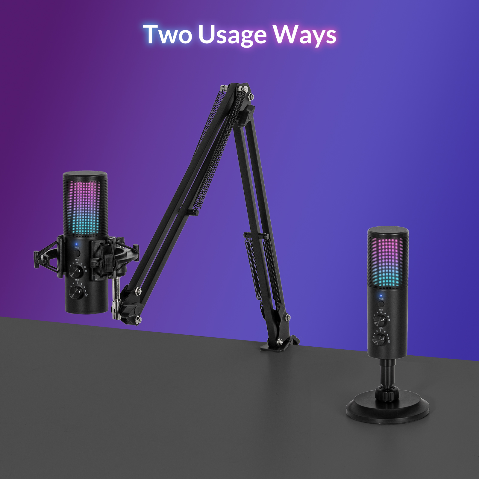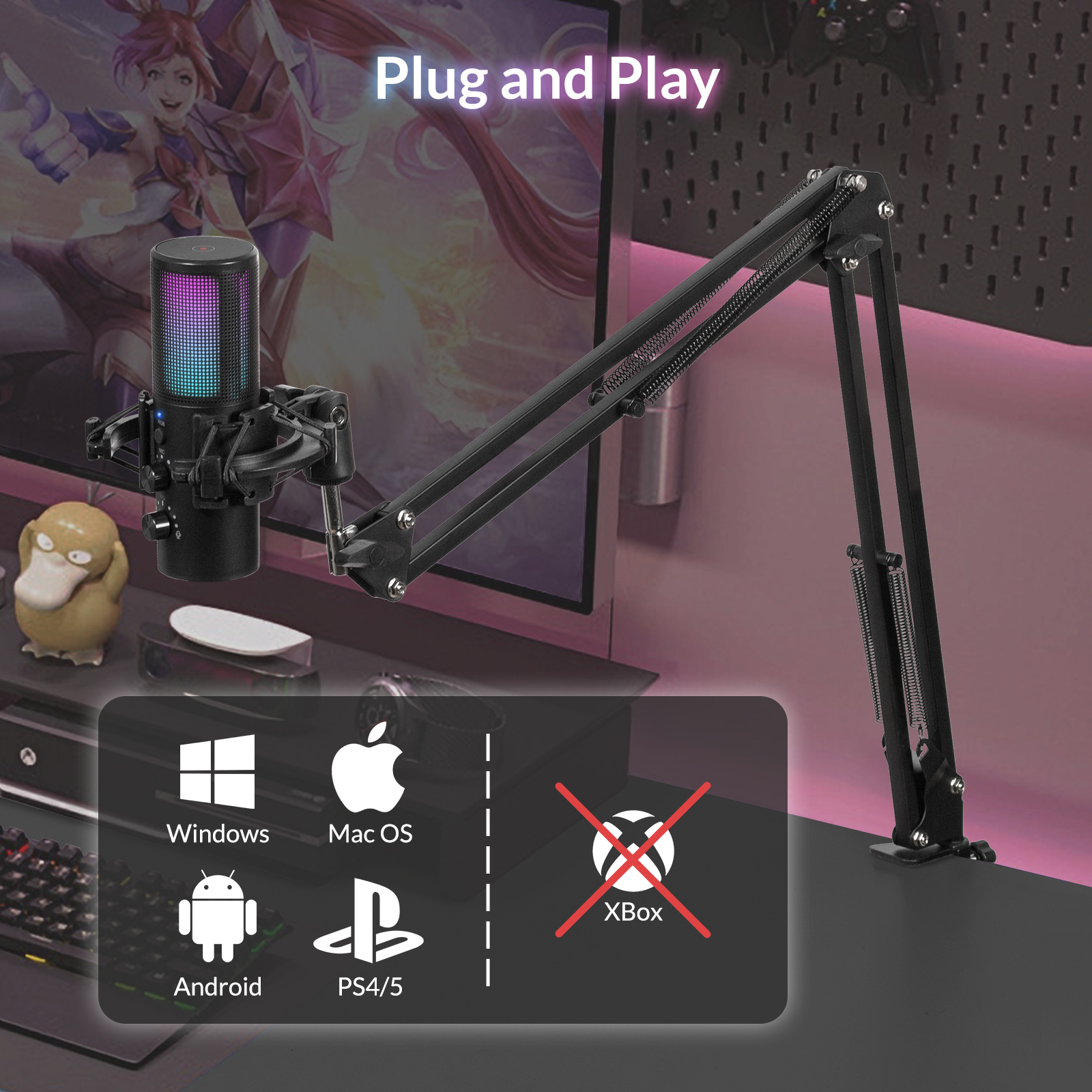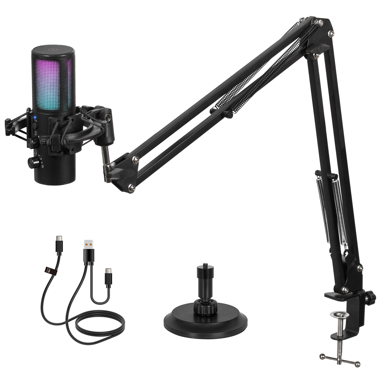 USB Micro Gaming Kit, RGB Microphone à Condensateur avec 11 Lumières Variables, Bras Micro, Support Micro