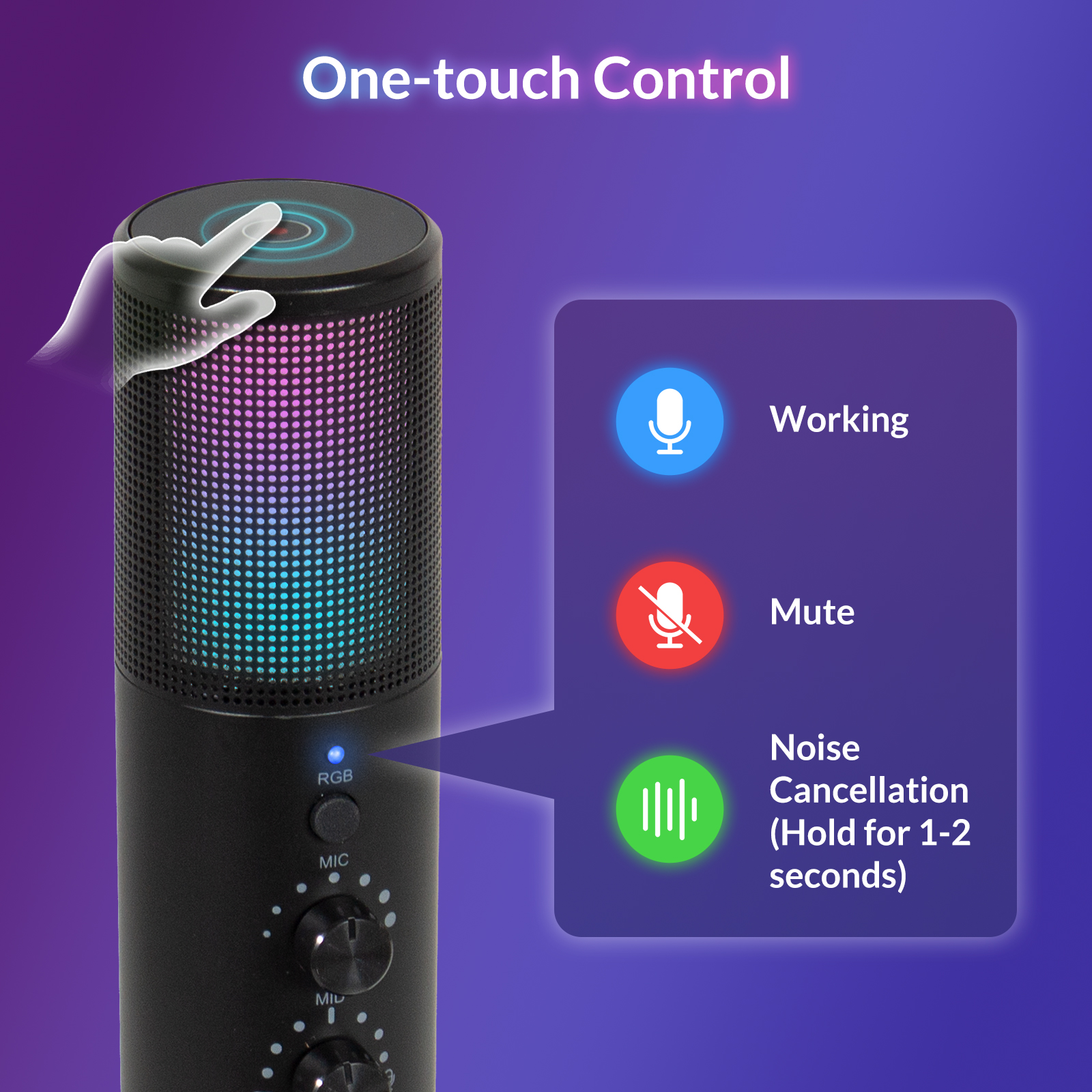 Contrôle du volume sans effort: coupez le microphone sans effort en appuyant sur le bouton supérieur, appuyez dessus et maintenez-le enfoncé pendant 1 à 2 secondes pour supprimer le bruit. La lumière LED indique l'état du microphone avec trois couleurs différentes. Réglez facilement le volume du microphone et du moniteur avec des boutons intuitifs.