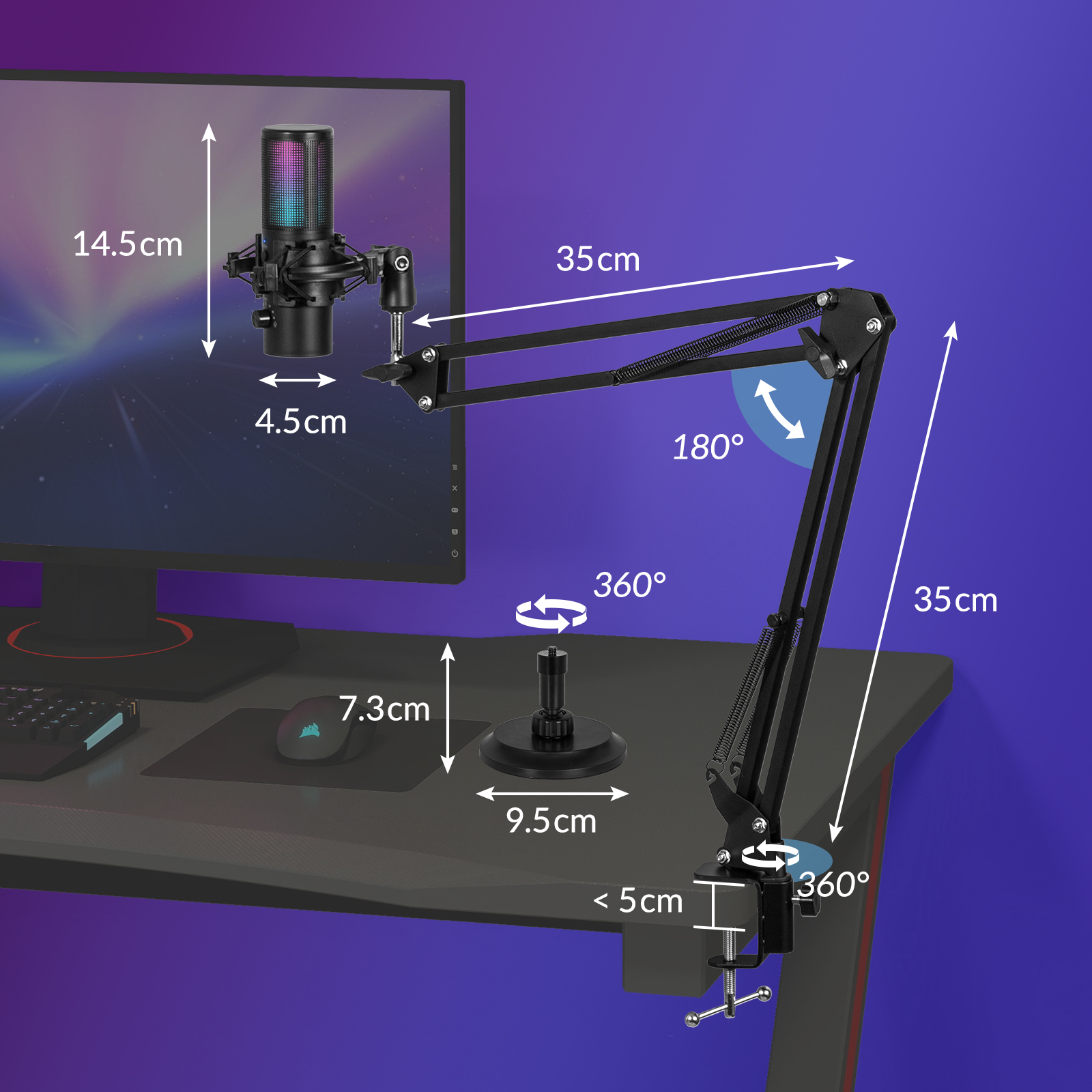 Design flexible et robuste: le microphone de jeu dispose d'un bras de perche réglable et d'une base de support robuste pour une utilisation polyvalente. Le support antichoc inclus réduit considérablement les vibrations et le bruit de la machine. Pliez facilement le bras de perche lorsqu'il n'est pas utilisé pour optimiser votre espace de travail.