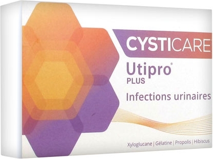Cysticare Utipro Plus Infections Urinaires 15 Gélules est un dispositif médical destiné à contrôler et prévenir les infections des voies urinaires causées par des agents pathogènes tels qu'E.coli et d'autres bactéries à Gram négatif, généralement responsables des infections urinaires. La formule de ce complément alimentaire contient une association de xyloglucane et gélatine qui a une action mécanique au niveau de l'intestin et évite que les agents pathogènes n'entrent en contact avec la muquese intestinale. Ce contact représente la première étape de multiplication des bactéries vers les voies urinaires. Elle contient aussi de la propolis, de l'hibiscus.