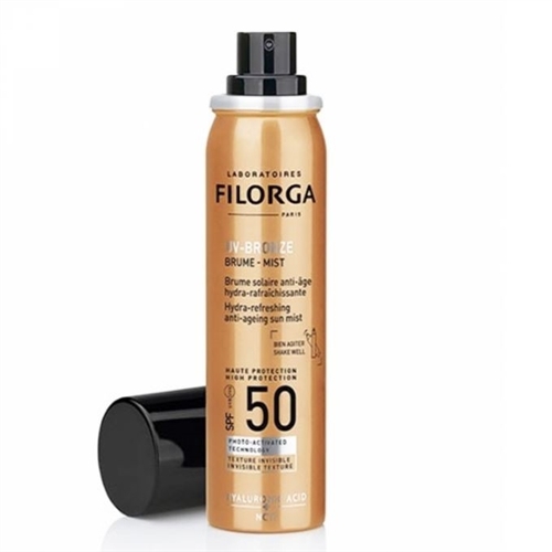 Filorga UV-Bronze Brume Solaire Anti-Âge SPF50 60 ml à la texture ultra-légère, rafraîchissante et invisible est une haute protection solaire anti-âge pour les peaux matures. Sa formule offre plusieurs actions : - bouclier anti-âge global [photo-activated technology] : un puissant antioxydant, activé par les rayons du soleil, qui met la peau sous haute protection UV + IR et permet de lutter contre les signes du vieillissement. - bombe rafraîchissante : de l'eau des glaciers micro-encapsulée tonifie la peau. - voile sublimateur de bronzage : un polysaccharide hydratant associé à la vitamine H réveille l'éclat du teint pour un bronzage sublimé. La peau est protégée et enveloppée dans un parfum délicieusement envoûtant.