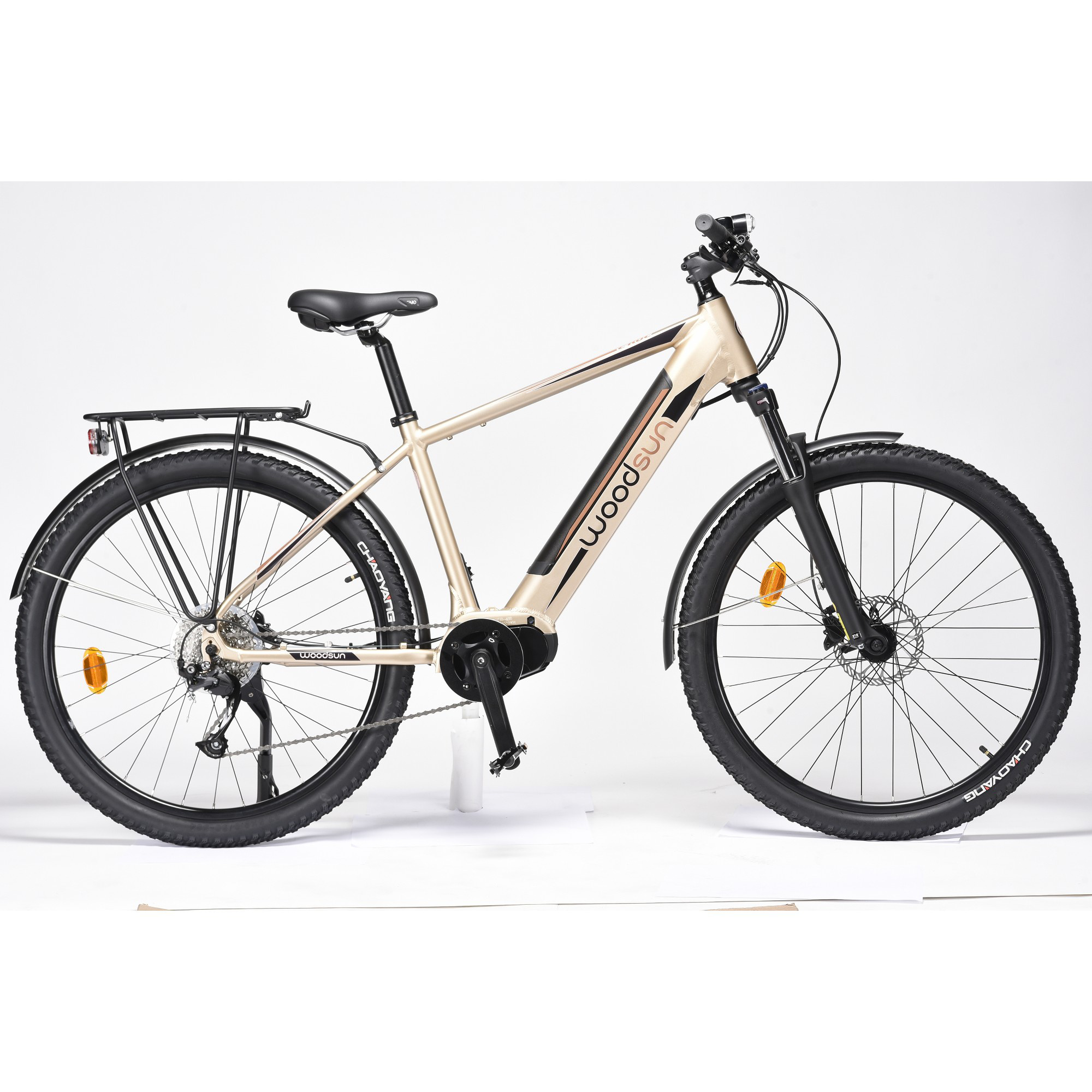 Cadre aluminium 27,5'' hauteur 45cm. Fourche à suspension HM 869S-HLO. Transmission : 79 vitesses Microshift TS39. Dérailleur arrière Microshift RDM36L MEZZO. Jantes : double parois Mach1. Freins à disques hydrauliques Alhonga.. Moteur : 250W/36V Central Ananda avec capteur de force, 80Nm. Batterie : lithium-ion intégrée, 36V/12,8Ah, 461W/h. Accessoires : pote-bagage, garde-boues, display LCD avec témoin de charge, 4 niveaux d'assistance. Poids : 23,8kg.