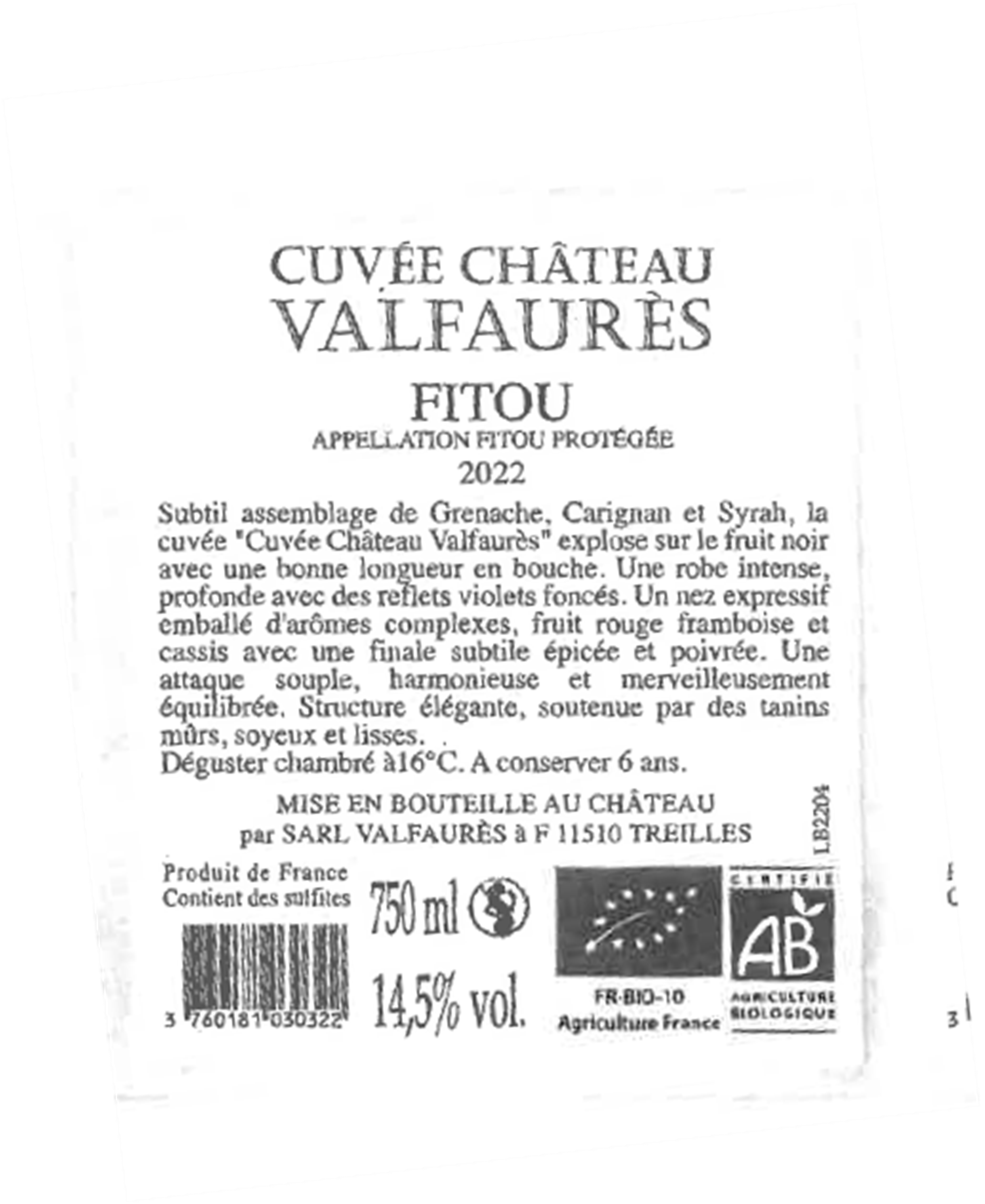 | Libellé | Valfaures BIO, 2022 - Fitou AOP - Rouge - 75 cl |
