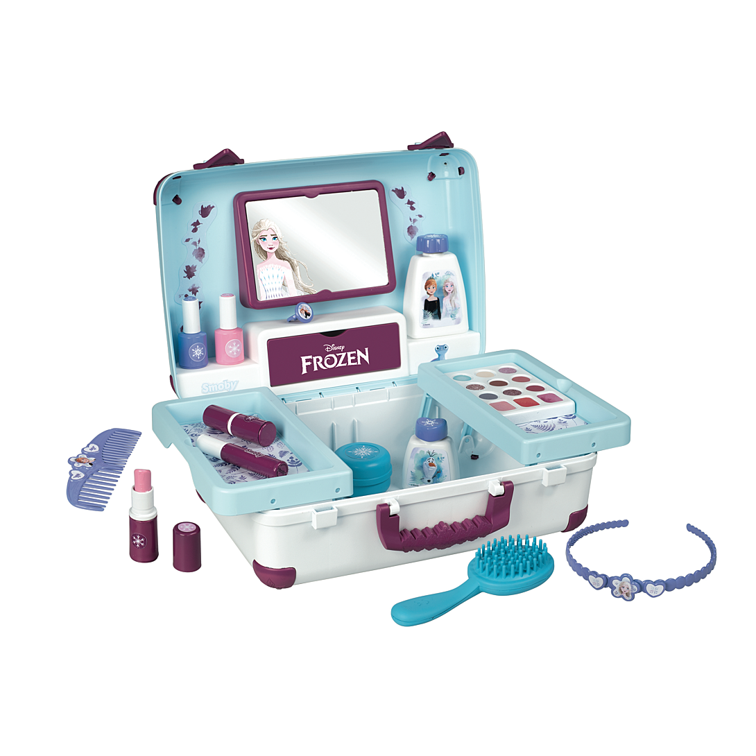 | Plus produit | Valise beauté La Reine des Neiges facile à transporter. 13 accessoires inclus: vernis, rouges à lèvres, palette de maquillage, brosse, bague Vrai miroir et trappe secrète inclus. |