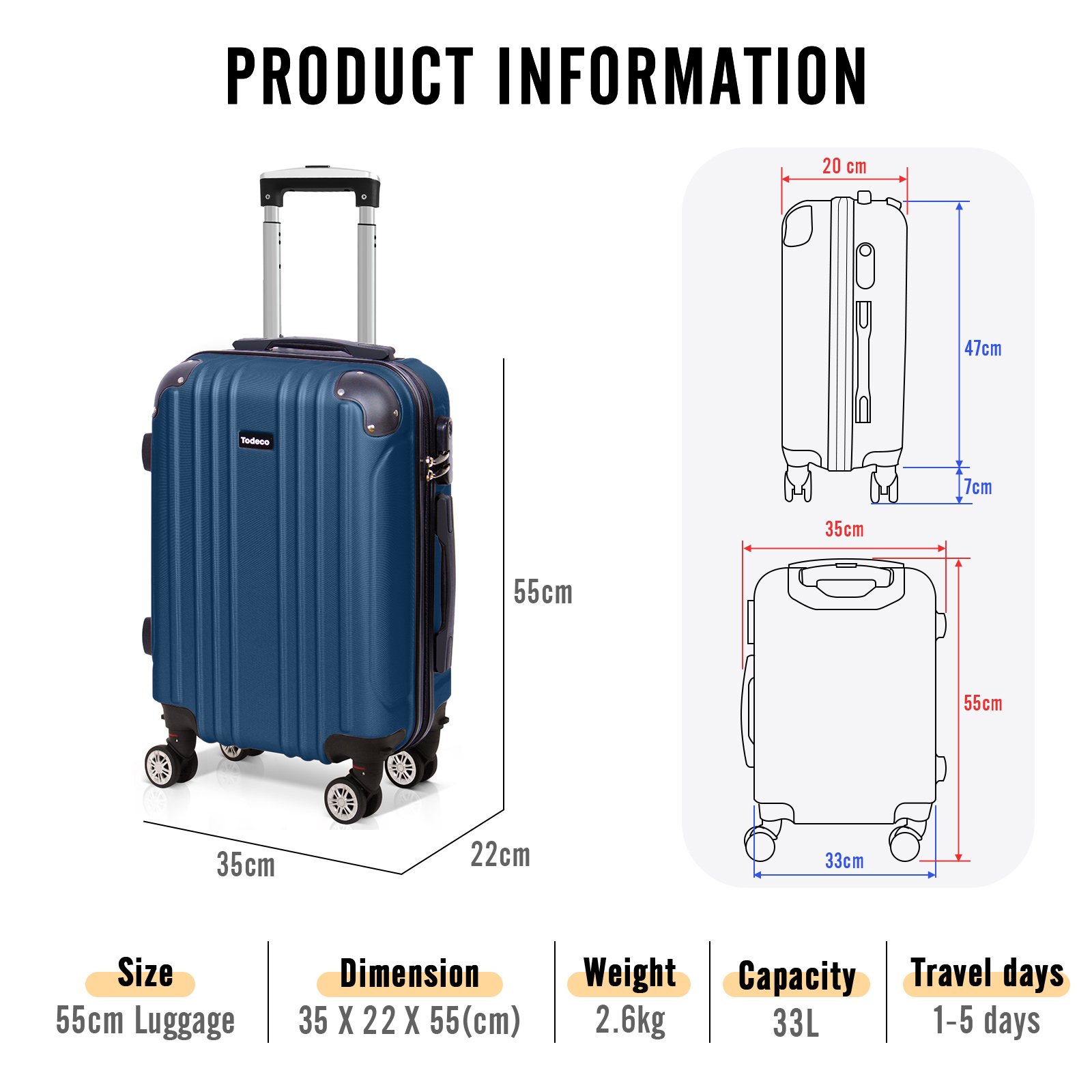 Grande capacité - Dimensions 55x35x22cm (avec tous les accessoires), 47x35x20cm (corps), poids 2,6kg, capacité 33L, un choix parfait pour les voyages d'une durée de 1 à 5 jours. Ce bagage à main répond à la plupart des restrictions de taille imposées par les compagnies aériennes. Veuillez vous référer aux exigences de chaque compagnie aérienne pour connaître les dimensions spécifiques.