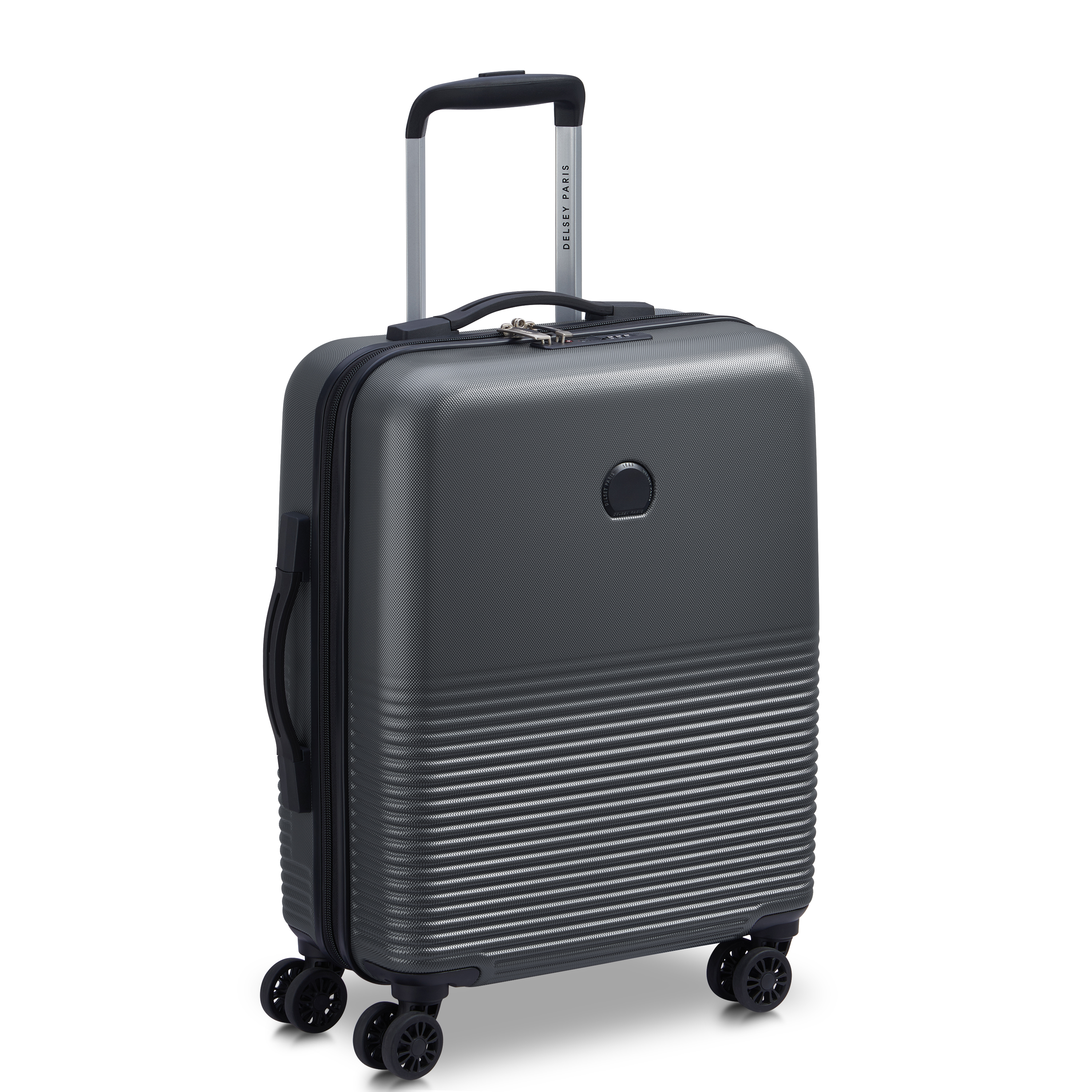 DELSEY MARINA trolley 55cm, ABS, gris, Ouverture double curseurs avec cadenas intégré à combinaison TSA, Système trolley intégré multi-positions avec bouton poussoir,Confort de roulage 360° avec 4 doubles roues multidirectionnelles, 2 poignées de portage latérale et supérieure,INTERIEUR : entièrement doublé - sangles de maintien - 1 grande poche zippée faisant office de 2nd compartiment avec poche filet plaquée zippée, Dimensions 55x40x20 cm -2,69 kg -44 L
