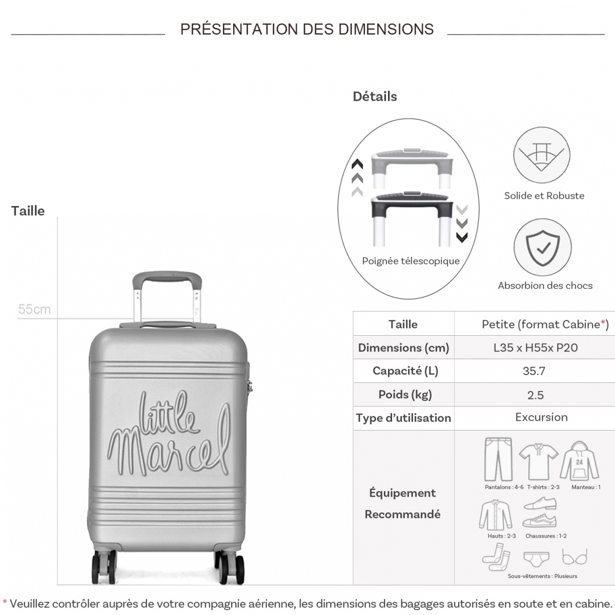 Les dimensions indiquées sont les dimensions extérieures des bagages, comprenant poignées, roulettes, pieds, poches latérales et autres éléments extérieurs.