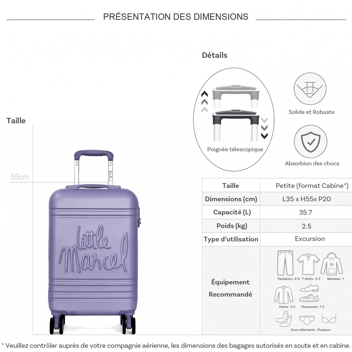 Les dimensions indiquées sont les dimensions extérieures des bagages, comprenant poignées, roulettes, pieds, poches latérales et autres éléments extérieurs.