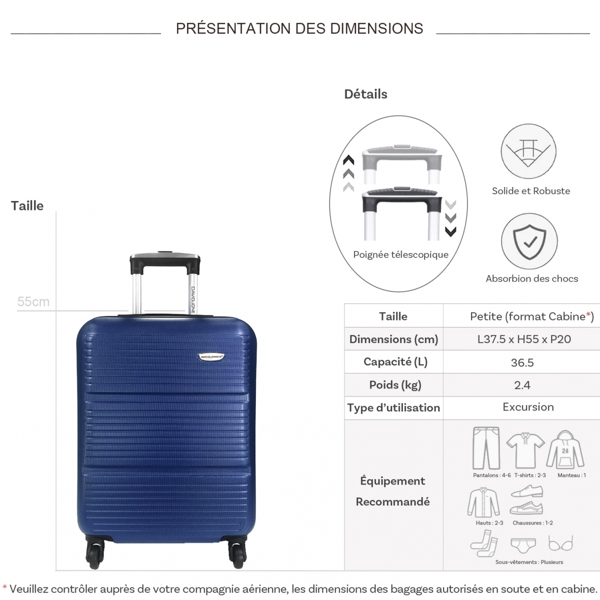 | Libellé | Valise cabine rigide 55cm |