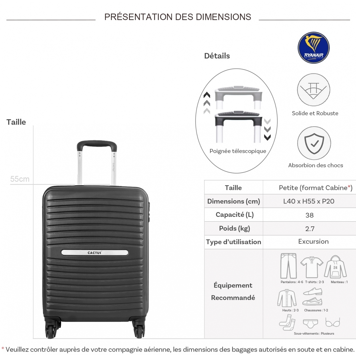 Remarque : Les dimensIons de cette valise sont compatibles avec la compagnie aérienne RYAN AIR.