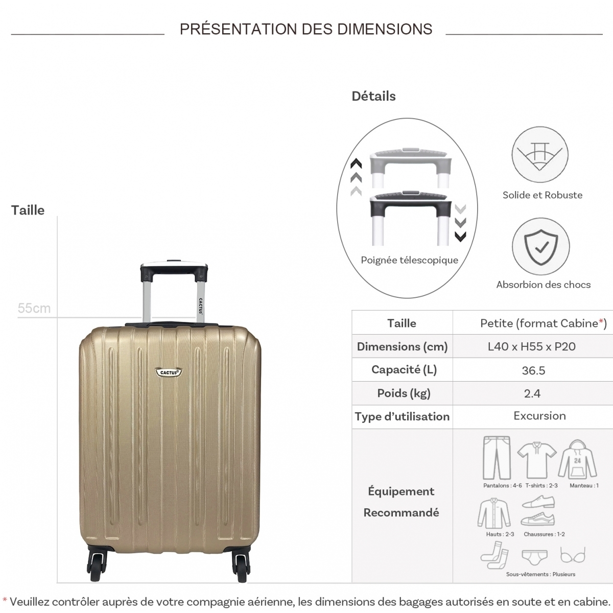 Les dimensions indiquées sont les dimensions extérieures des bagages, comprenant poignées, roulettes, pieds, poches latérales et autres éléments extérieurs.