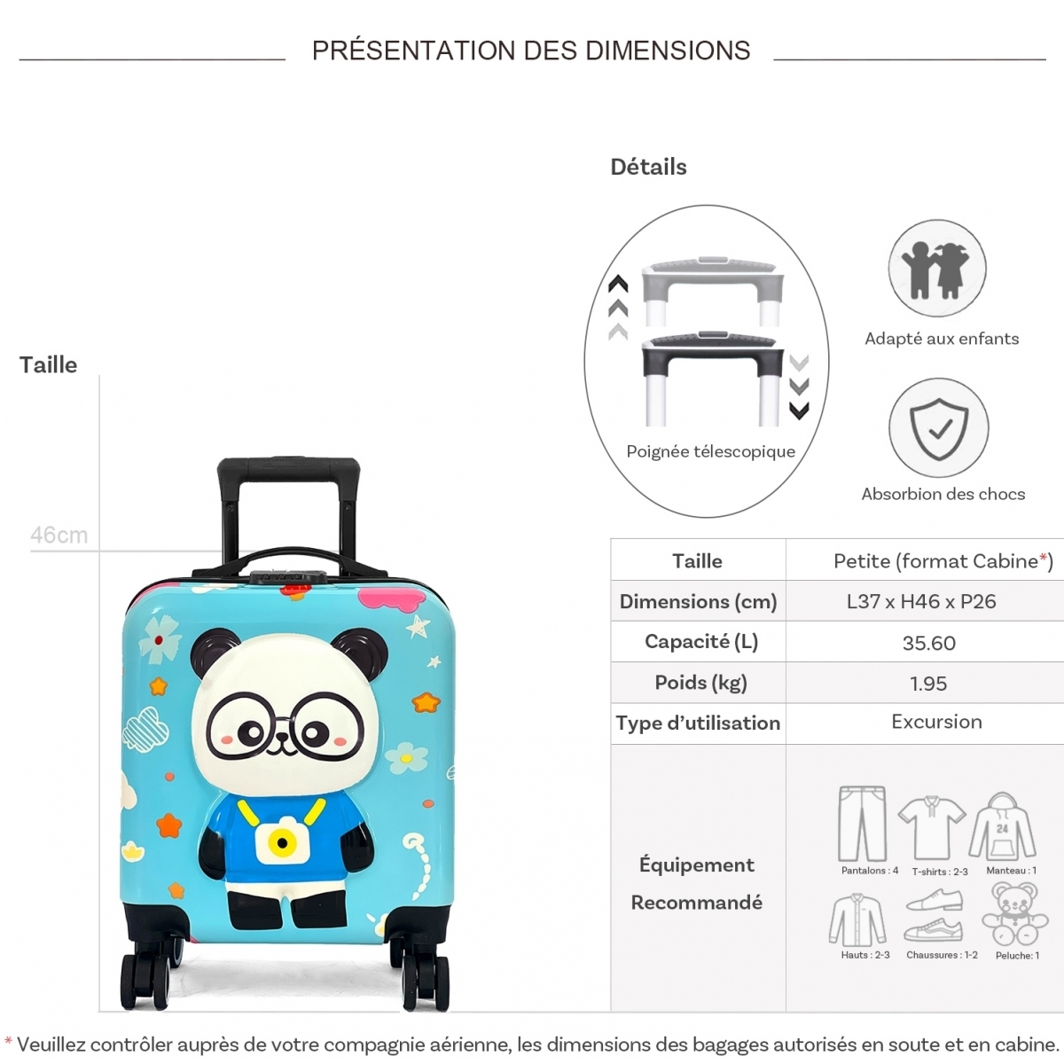 Les dimensions indiquées sont les dimensions extérieures des bagages, comprenant poignées, roulettes, pieds, poches latérales et autres éléments extérieurs.