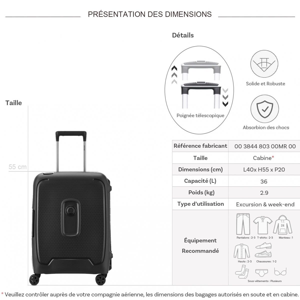 | Libellé | Valise cabine rigide Moncey 55cm TSA polypropylène |