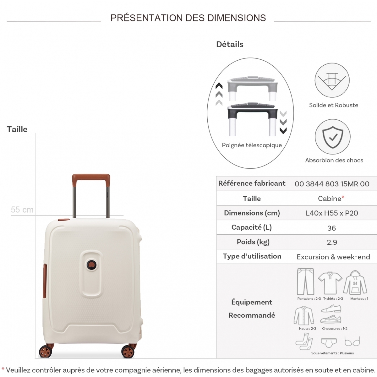Les dimensions indiquées sont les dimensions extérieures des bagages, comprenant poignées, roulettes, pieds, poches latérales et autres éléments extérieurs.