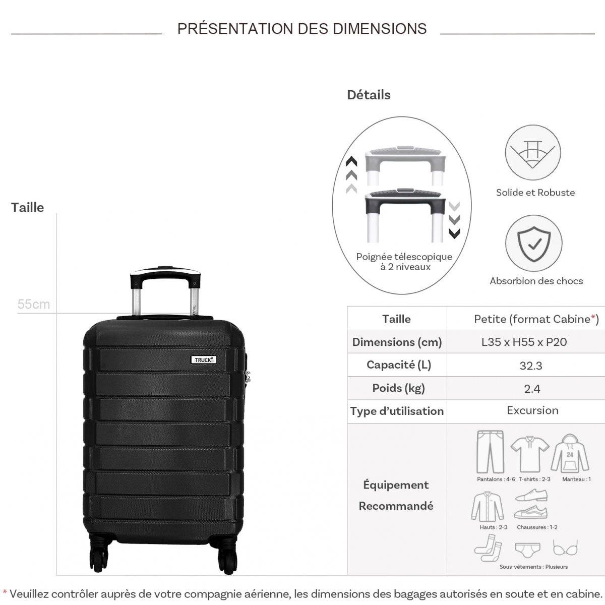 | Libellé | Valise cabine rigide passe-partout Truck ABS avec 4 roulettes multidirectionnelles et serrure à code - Noir profond |