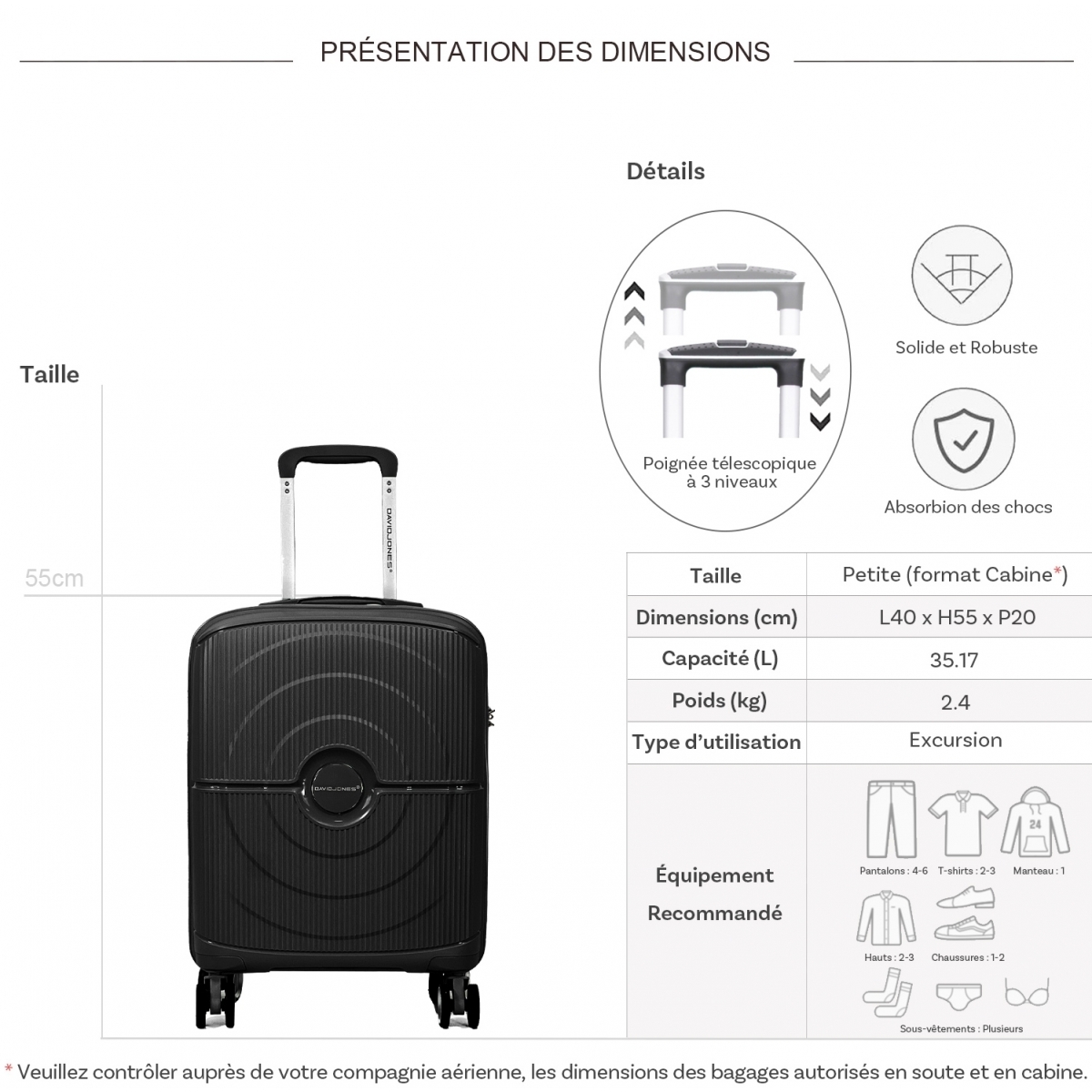 Les dimensions indiquées sont les dimensions extérieures des bagages, comprenant poignées, roulettes, pieds, poches latérales et autres éléments extérieurs.