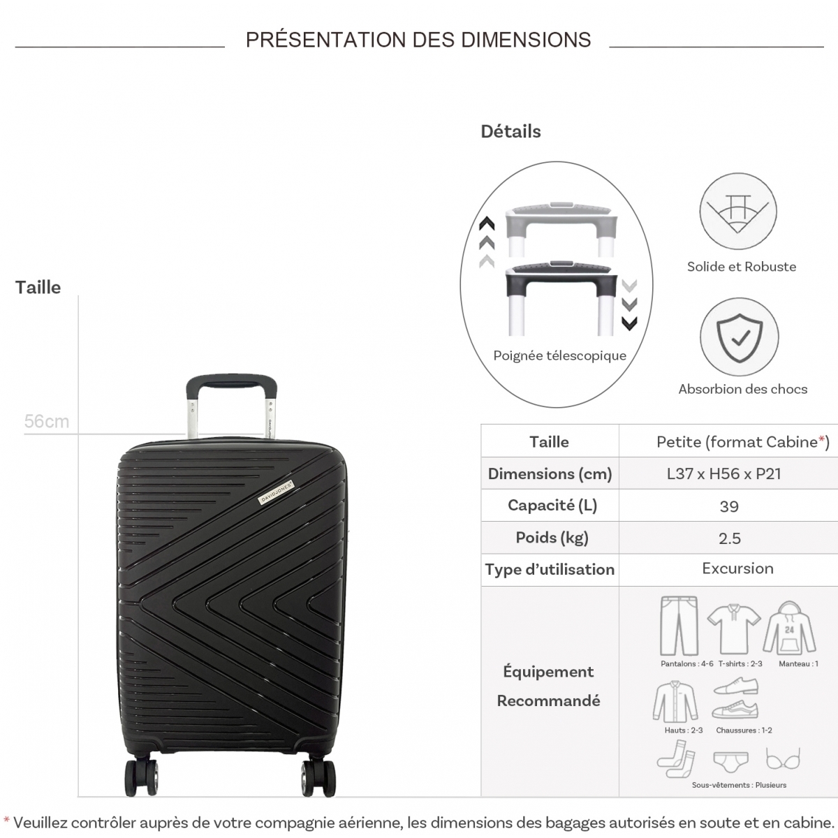 Les dimensions indiquées sont les dimensions extérieures des bagages, comprenant poignées, roulettes, pieds, poches latérales et autres éléments extérieurs.