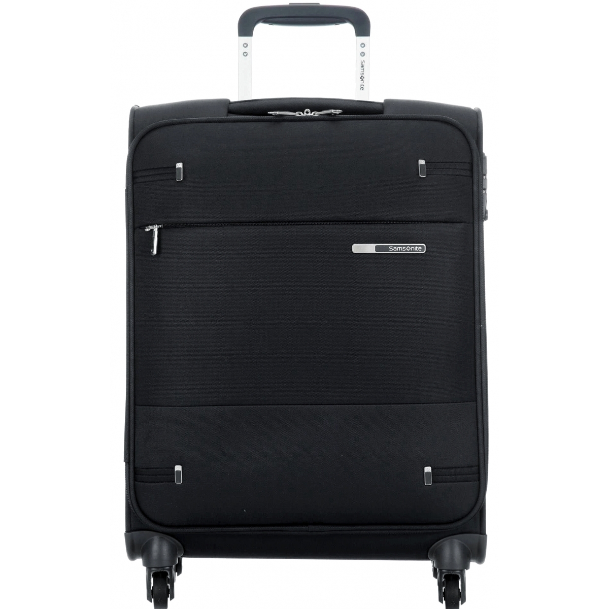 Détails extérieurs : Fermeture zippée, 1 grande poche zippée sur le devant de la valise, 4 roulettes de transport pivotantes à 360°, Canne télescopique réglable en hauteur à l'aide d'un bouton pression, 1 poignée supérieure rembourrée pour un port à la main, 1 porte étiquette, Serrure TSA, Siglé Samsonite.