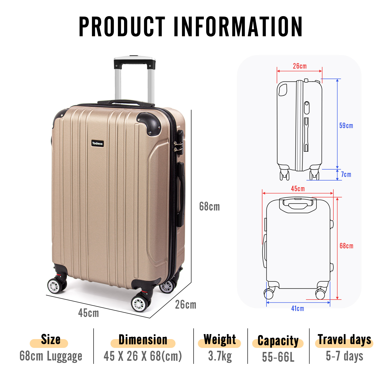 Libellé Valise moyenne taille 65cm, valise de voyage, rigide e légère abs valise de voyage à roulettes valises, 4 doubles roues, 42x26x65cm, champagne