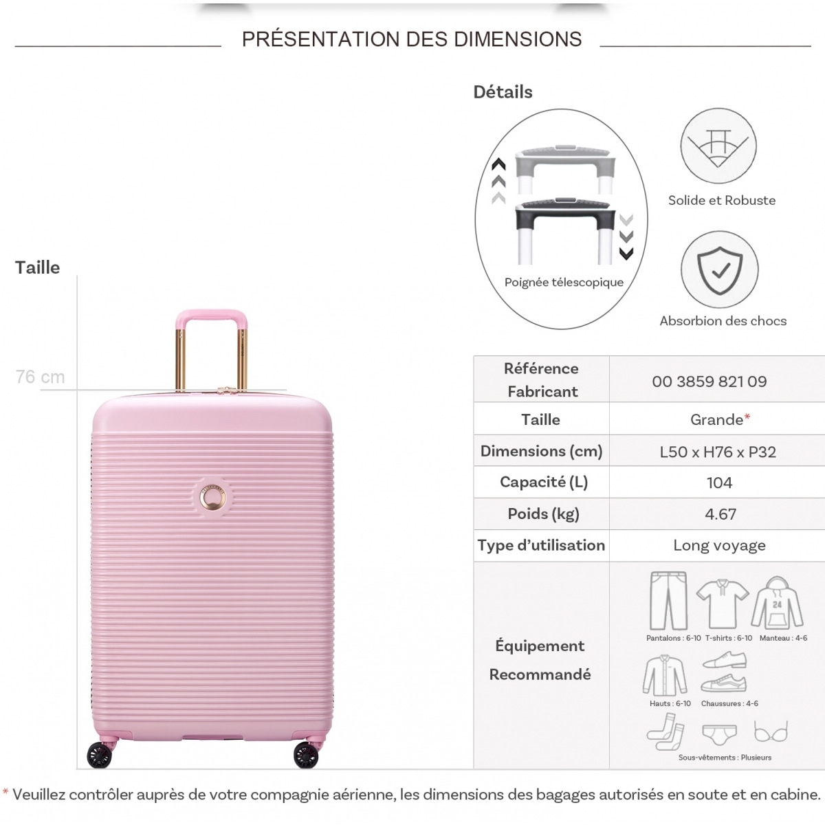Les dimensions indiquées sont les dimensions extérieures des bagages, comprenant poignées, roulettes, pieds, poches latérales et autres éléments extérieurs.