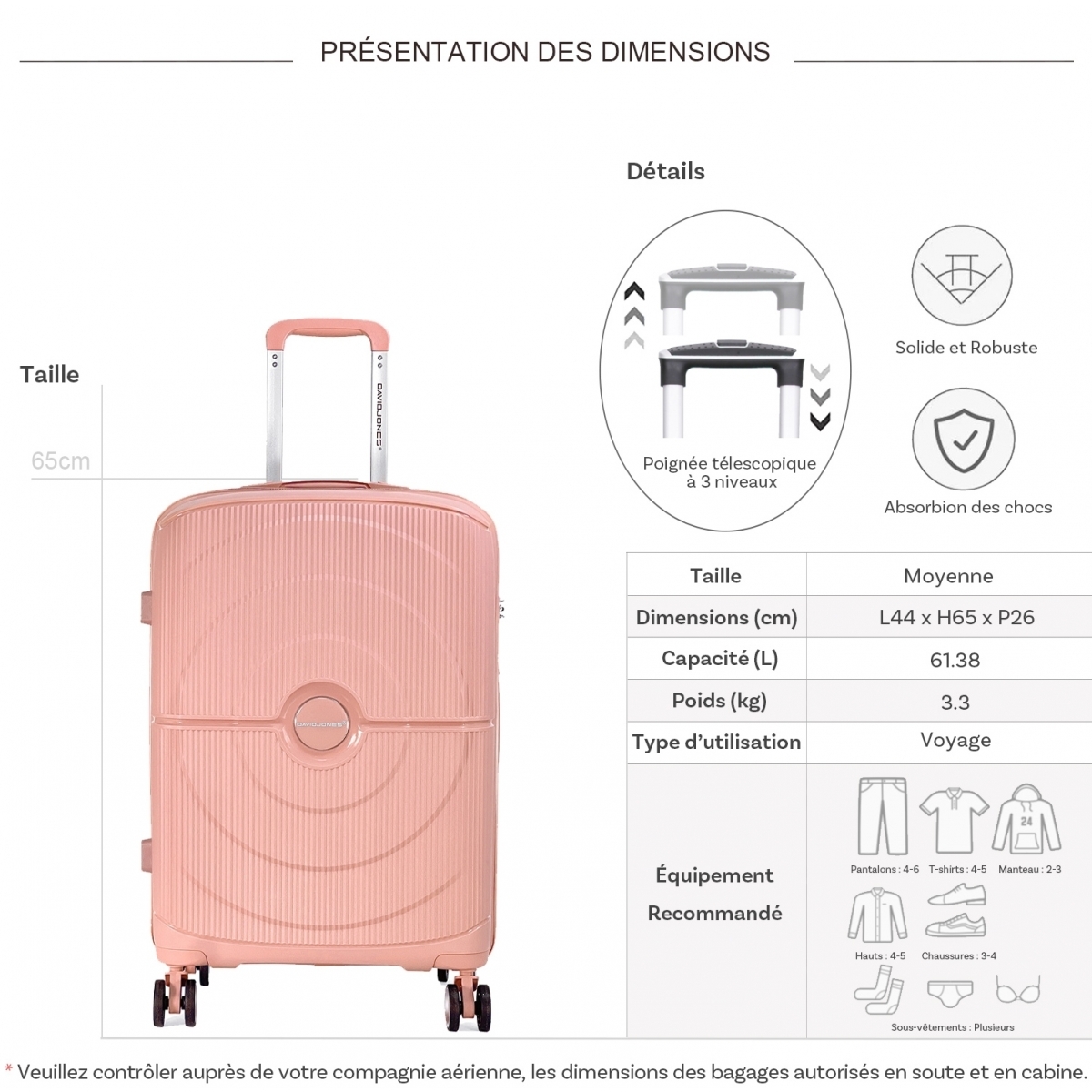 Les dimensions indiquées sont les dimensions extérieures des bagages, comprenant poignées, roulettes, pieds, poches latérales et autres éléments extérieurs.
