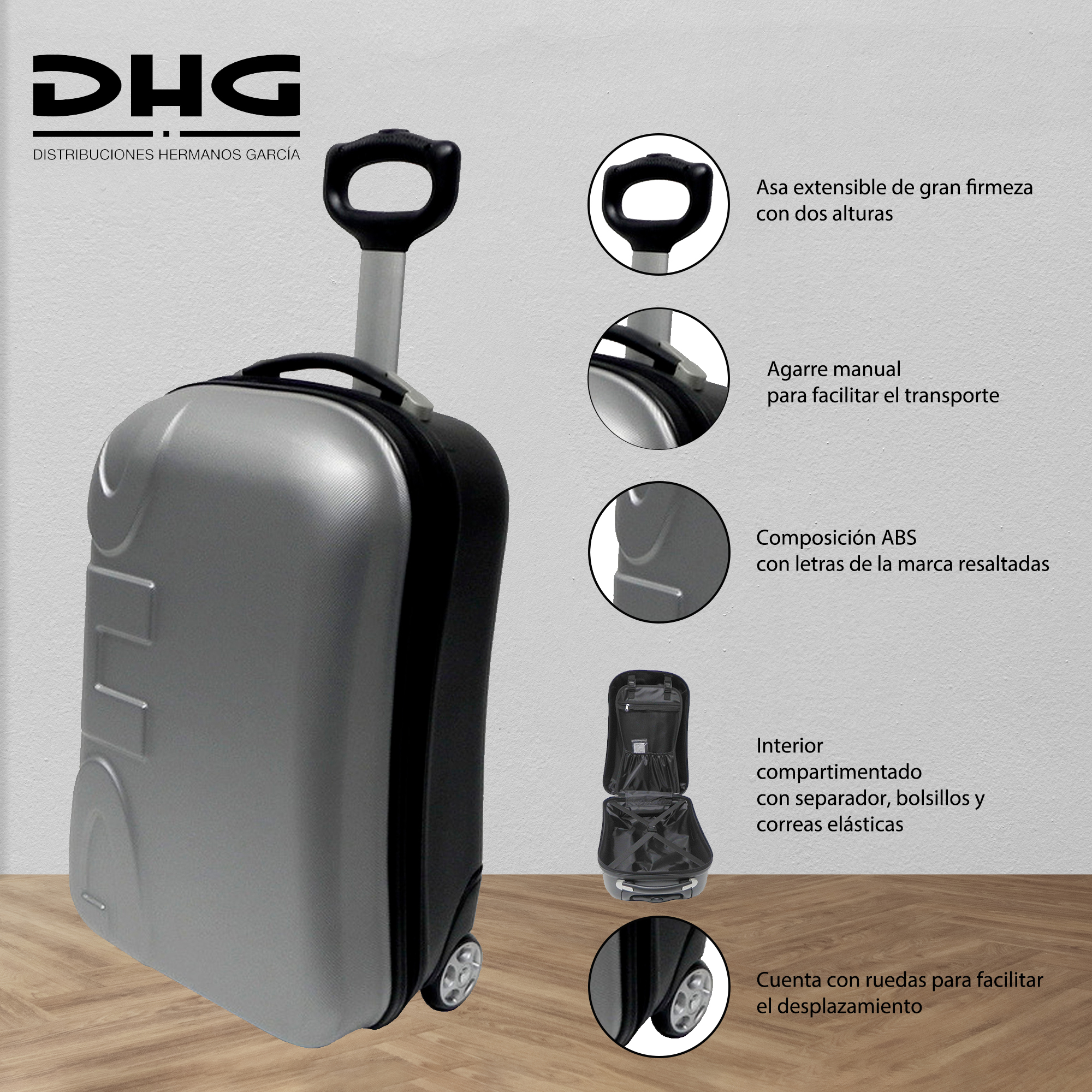 Valise Trolley 20" DHG Chariot rigide 20 " taille cabine. Compatible avec les bagages cabine standard selon la réglementation IATA (International Air Transport Association). Agile et résistant. Finition intérieure complète avec séparateur, poches et sangles élastiques pour faciliter la commande. Poignée extensible d'une grande fermeté avec deux hauteurs pour faciliter son transport et son déplacement. Gris. Dimensions : 54 x 36 x 22 cm.